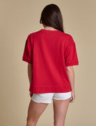 This boxy pullover is a modern twist on collegiate cool — made to turn heads from tailgate to town. Featuring an oversized fit, glitter script piping, and ultra-soft French terry fabric, it’s the perfect balance between all-day comfort and standout style. We're styling it with leather shorts and boots for game day, or layered over a mini dress for an unexpected, off-duty moment.