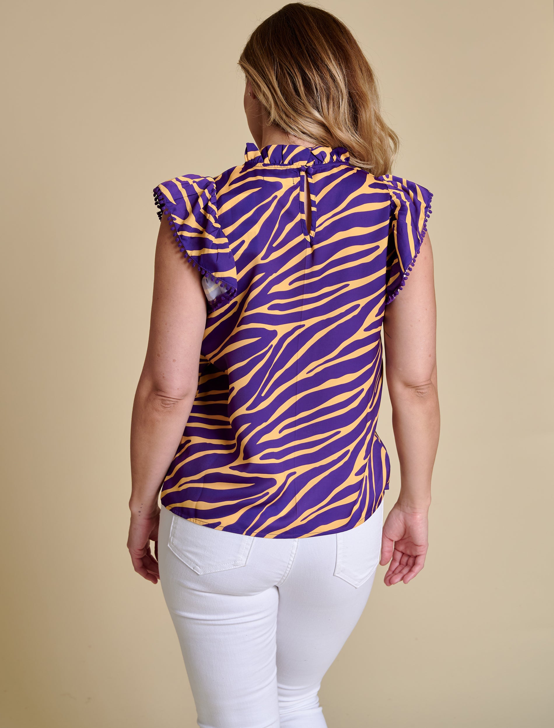 This polished tank top features all the feminine details — a frill mock neckline, fluttery ruffle sleeves, and playful pom trim. Lightweight and easy to style, it’s perfect for warm-weather tailgates or layering under a jacket when temps dip. A keyhole back closure finishes the look with an elegant touch.
