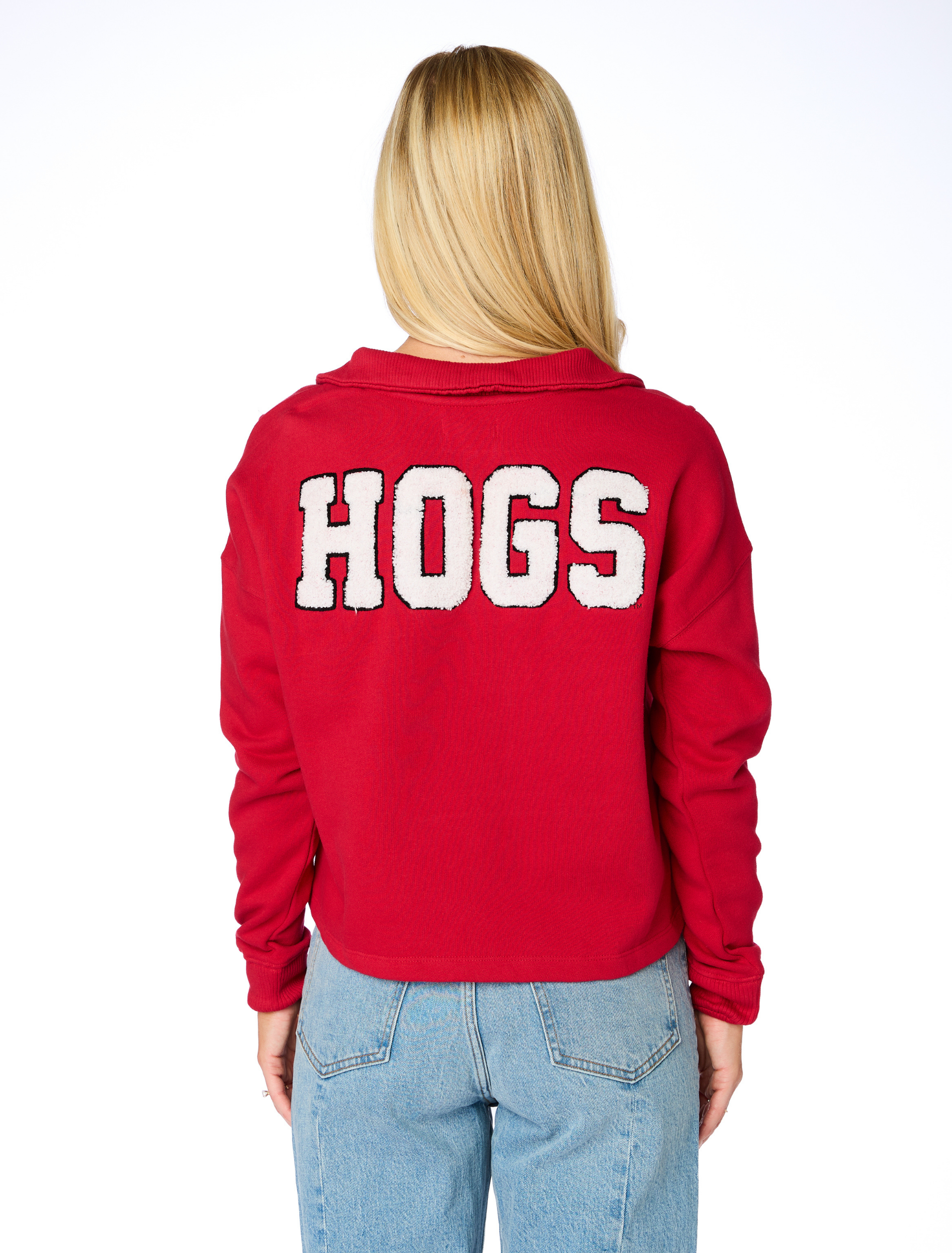Elevate your game day look with our lux collared sweater. The v-neck oversized rib collar, side panels, and chenille lettering on back give you a chic look, while the boxy fit is flattering on all body types. This top is officially licensed so a portion of your purchase directly supports the university.