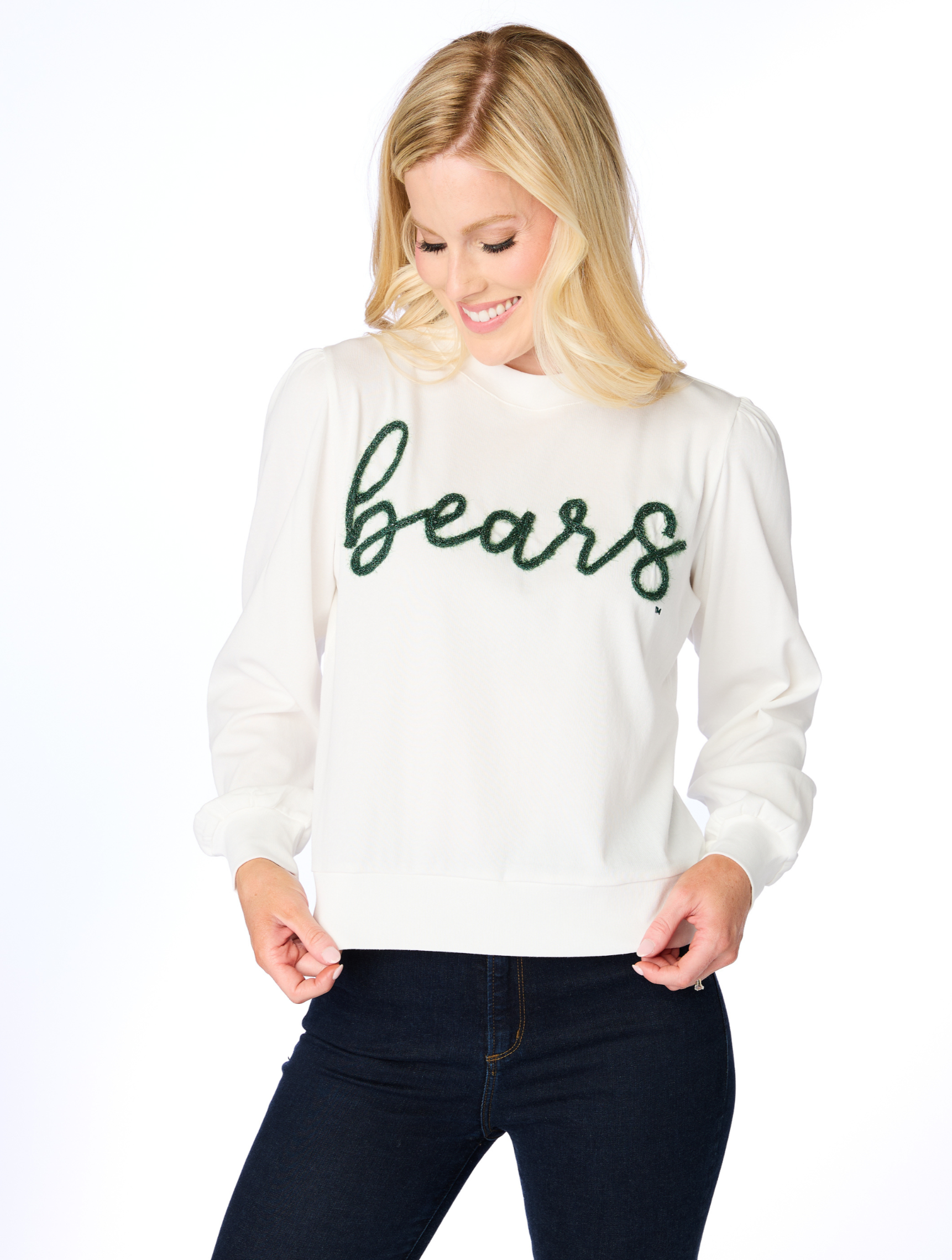 The long sleeve version of our best seller, this lightweight sweater with oversized glitter piping and a slight puff sleeve is the perfect statement piece. This top is officially licensed so a portion of your purchase directly supports the university.