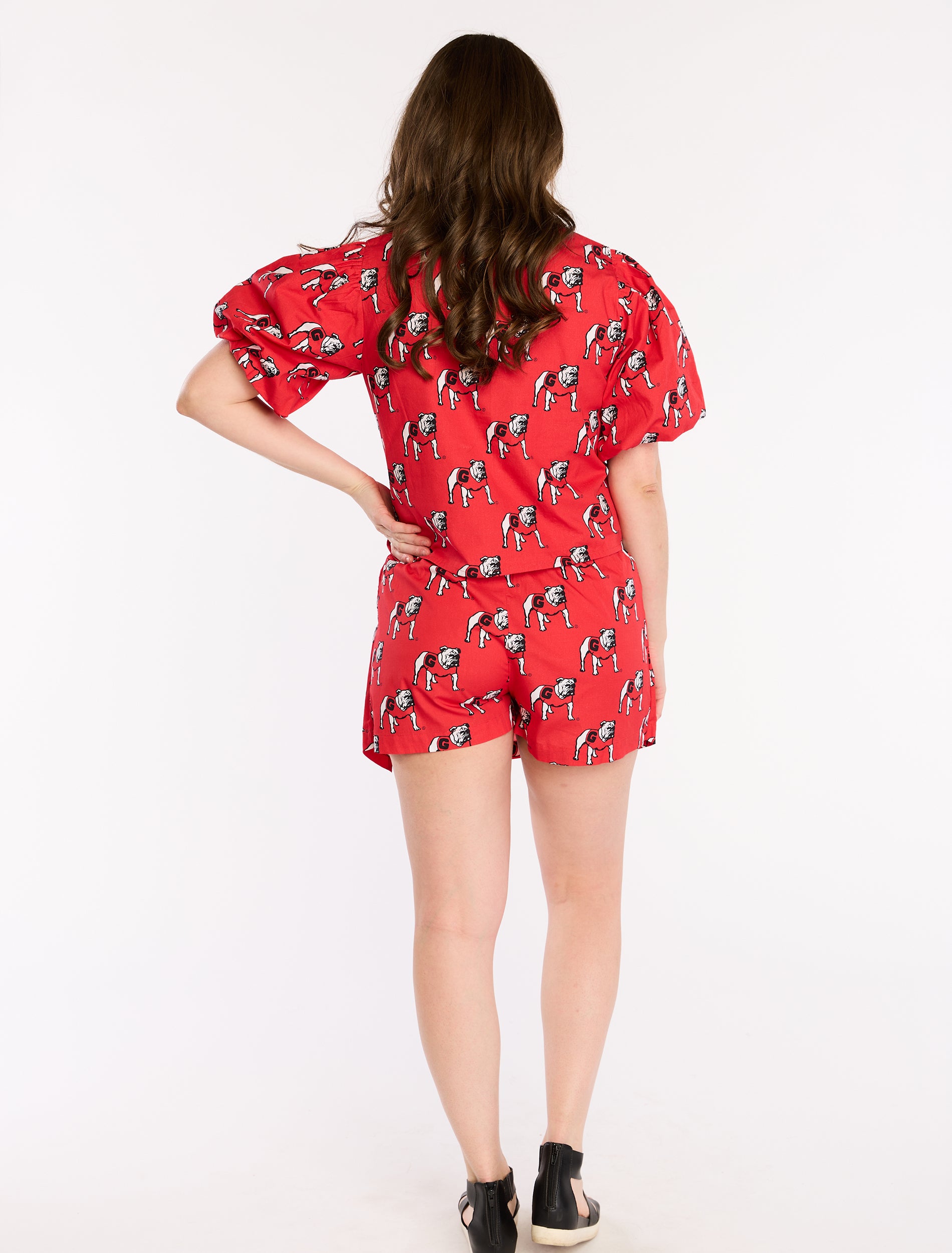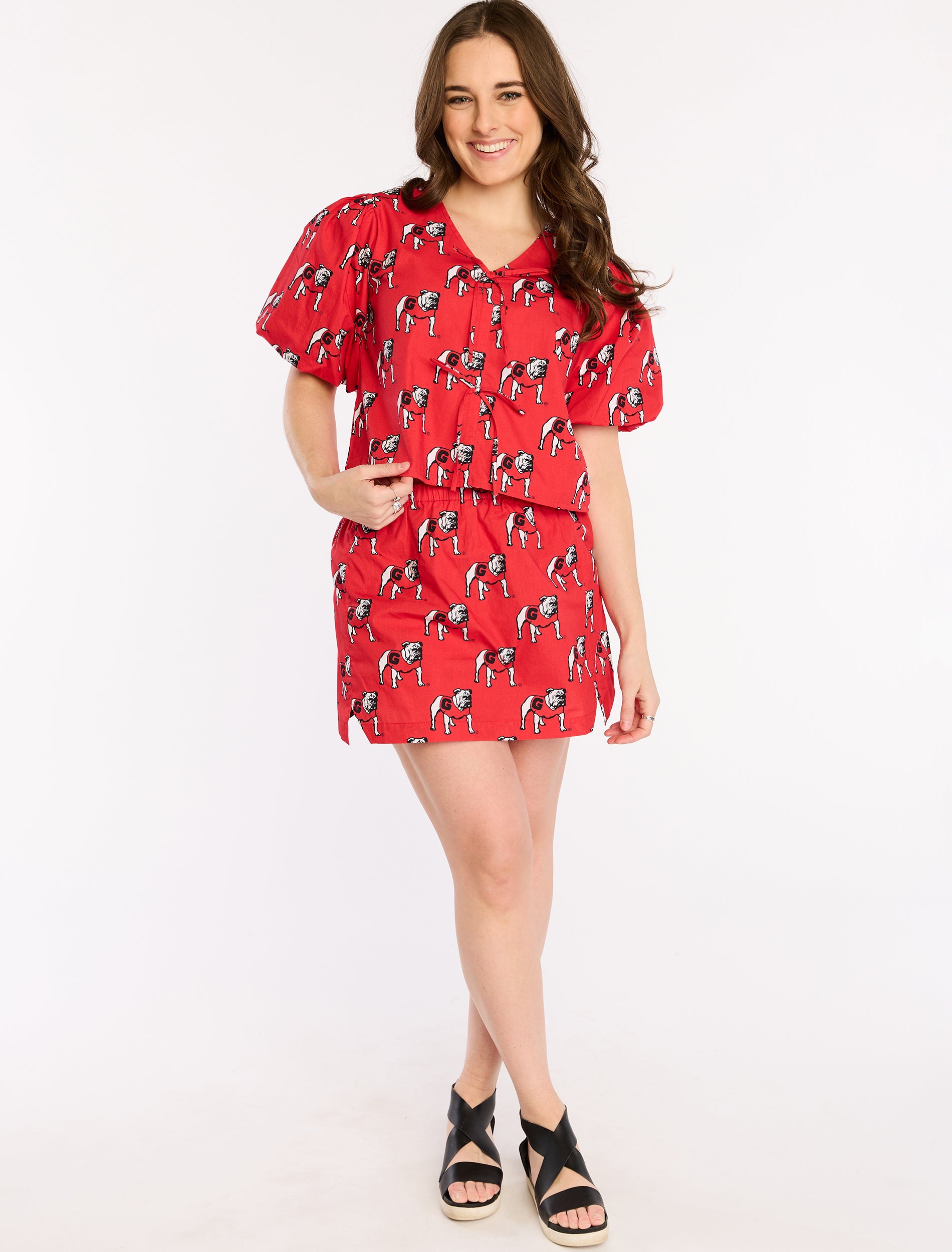 This logo-printed skort is the perfect combination of playful and polished. Designed with clean front seams and angled hemline slits, it’s a flirty take on a classic bottom. We love it with our matching Poplin Tie Top and platform wedges for a full set moment.