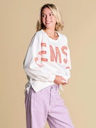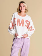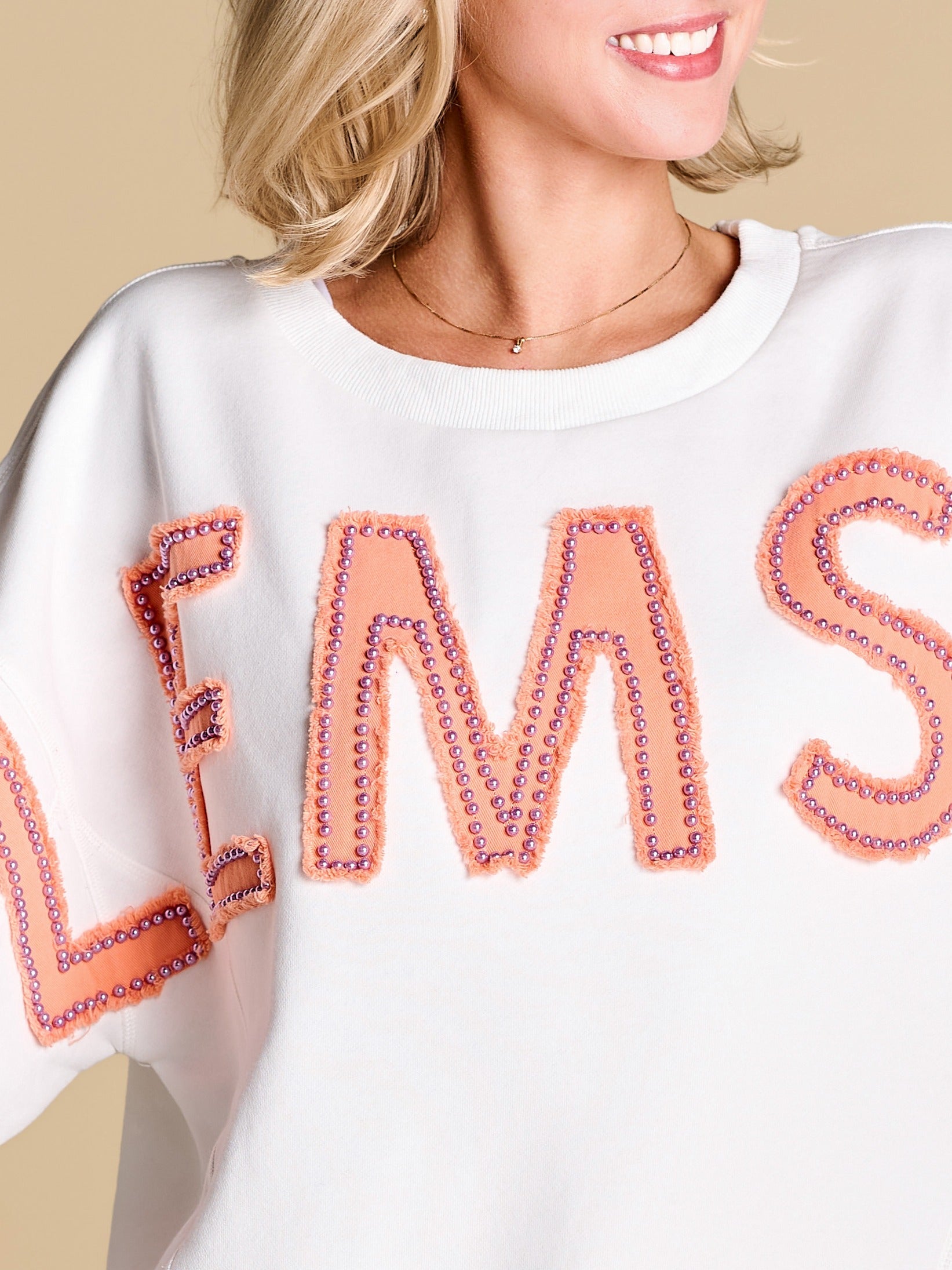 An elevated take on off-duty style, finished with raw-edge appliqué lettering and contrast pearl outlining. A warm-weather staple you’ll reach for on repeat, from slow market mornings to spirited match-day moments.