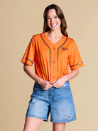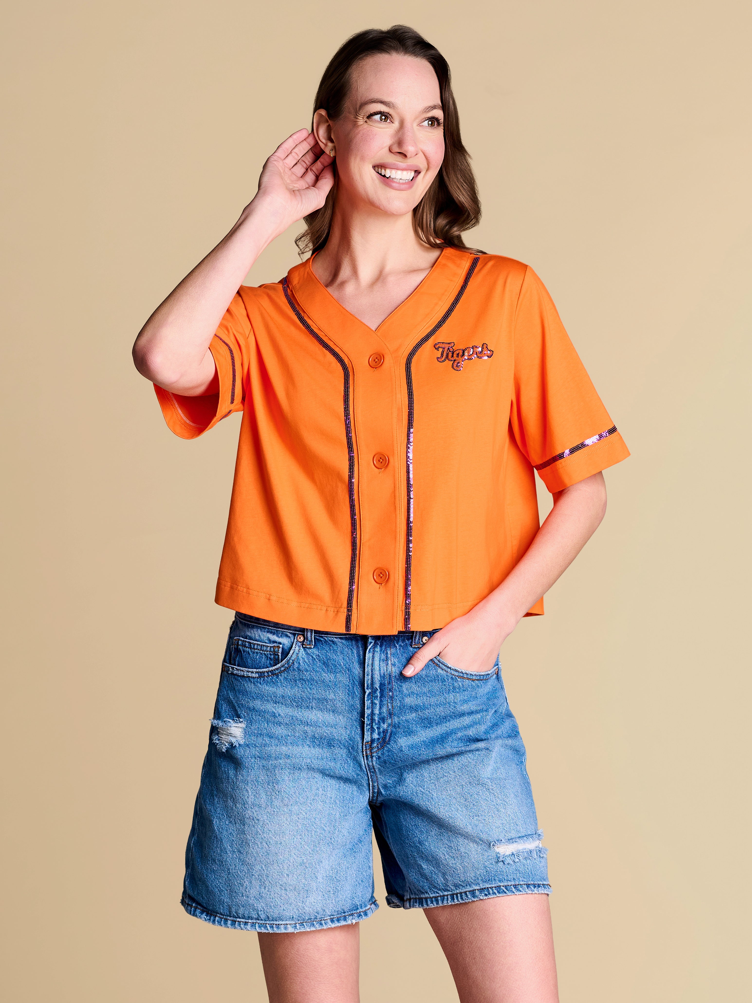 This boxy, button-up jersey is made for stepping up to the plate in style, with a classic baseball-inspired silhouette and sequin statement detailing. Crafted from a comfy, casual cotton fabric, it’s the MVP you’ll reach for from morning coffee to afternoon innings