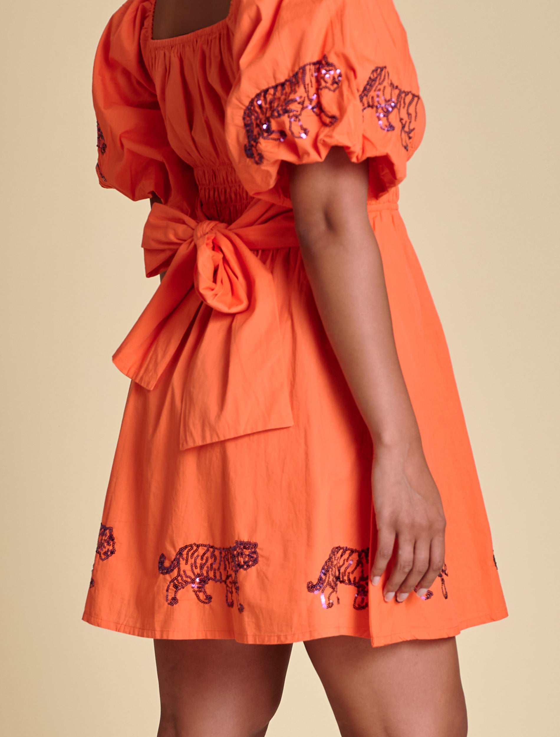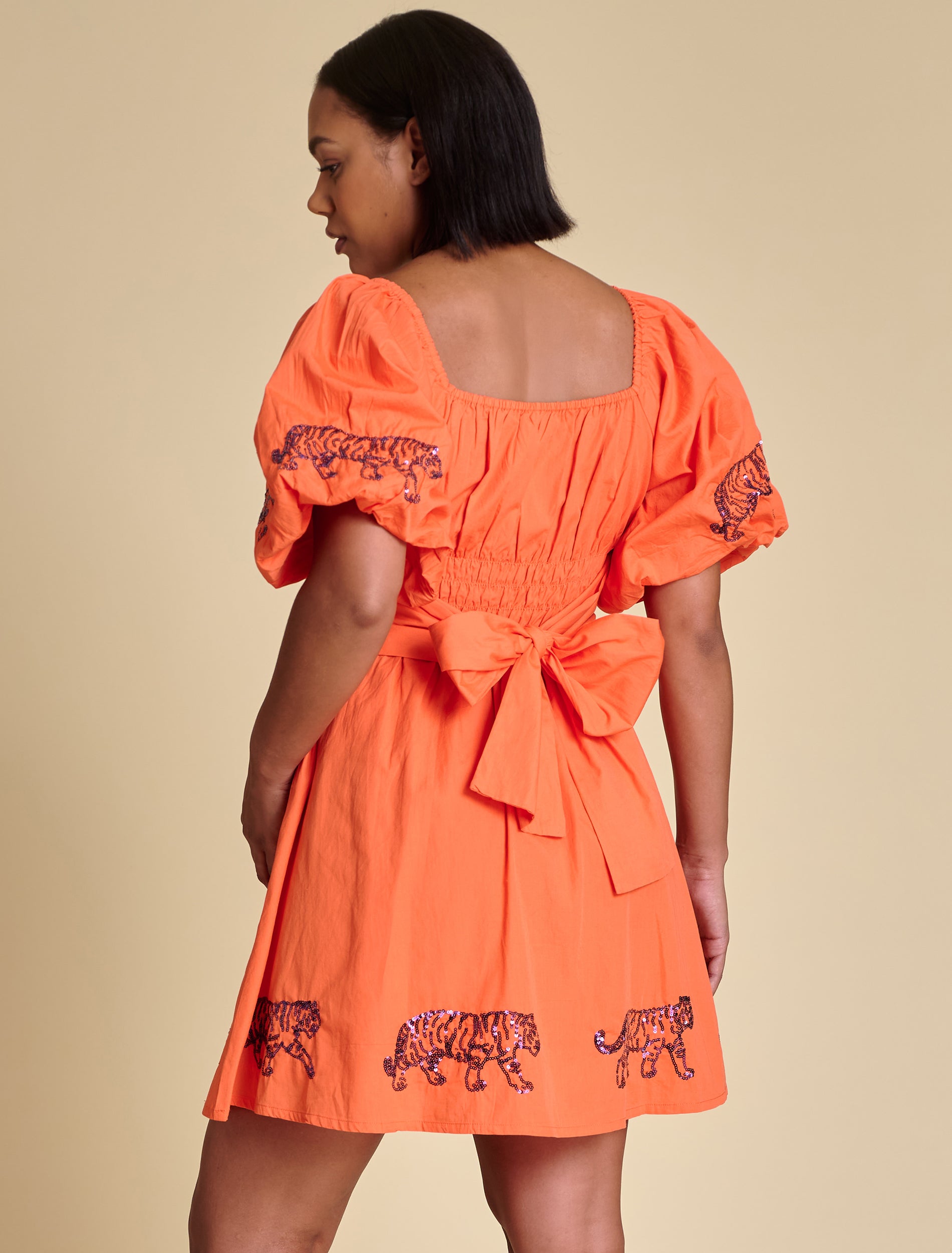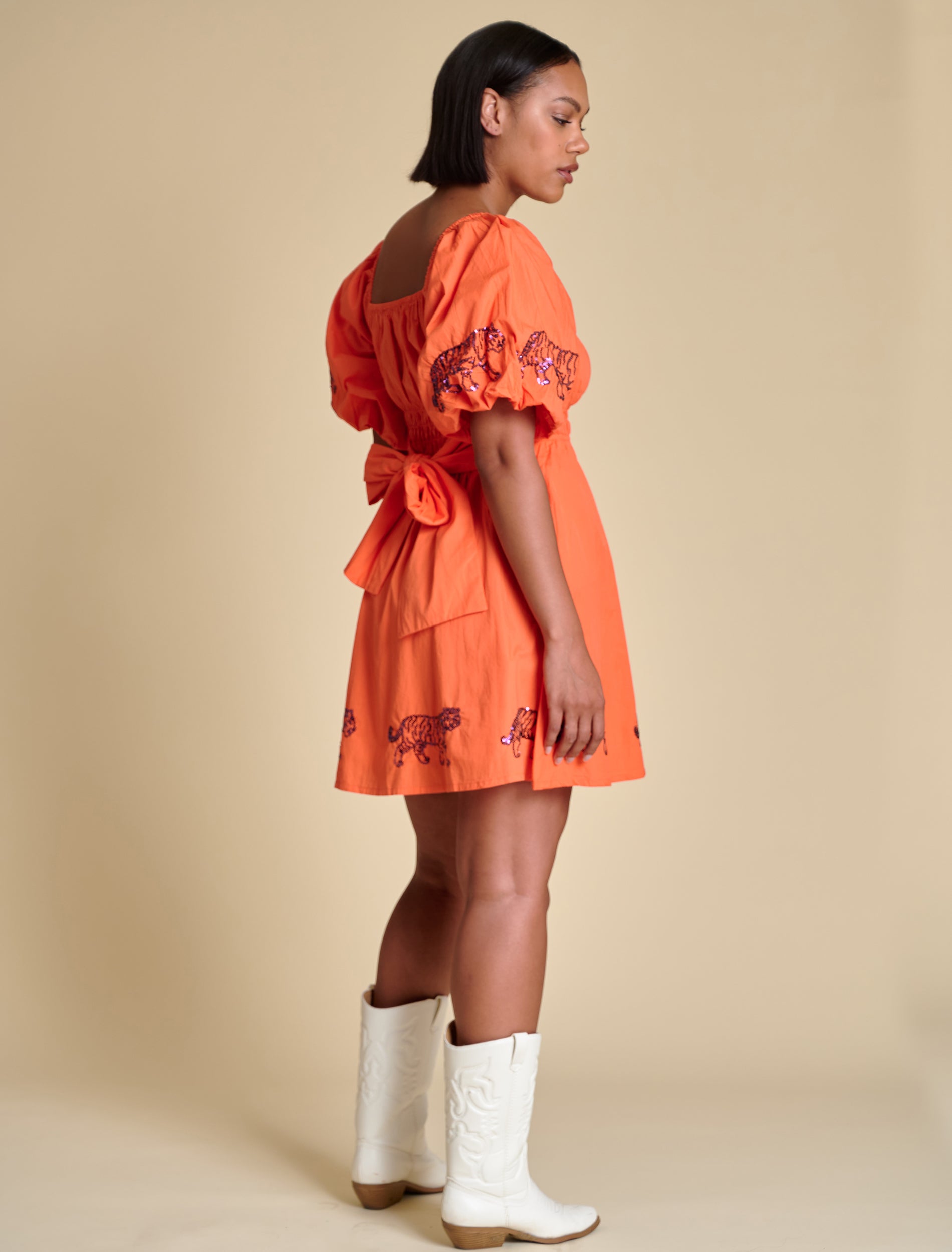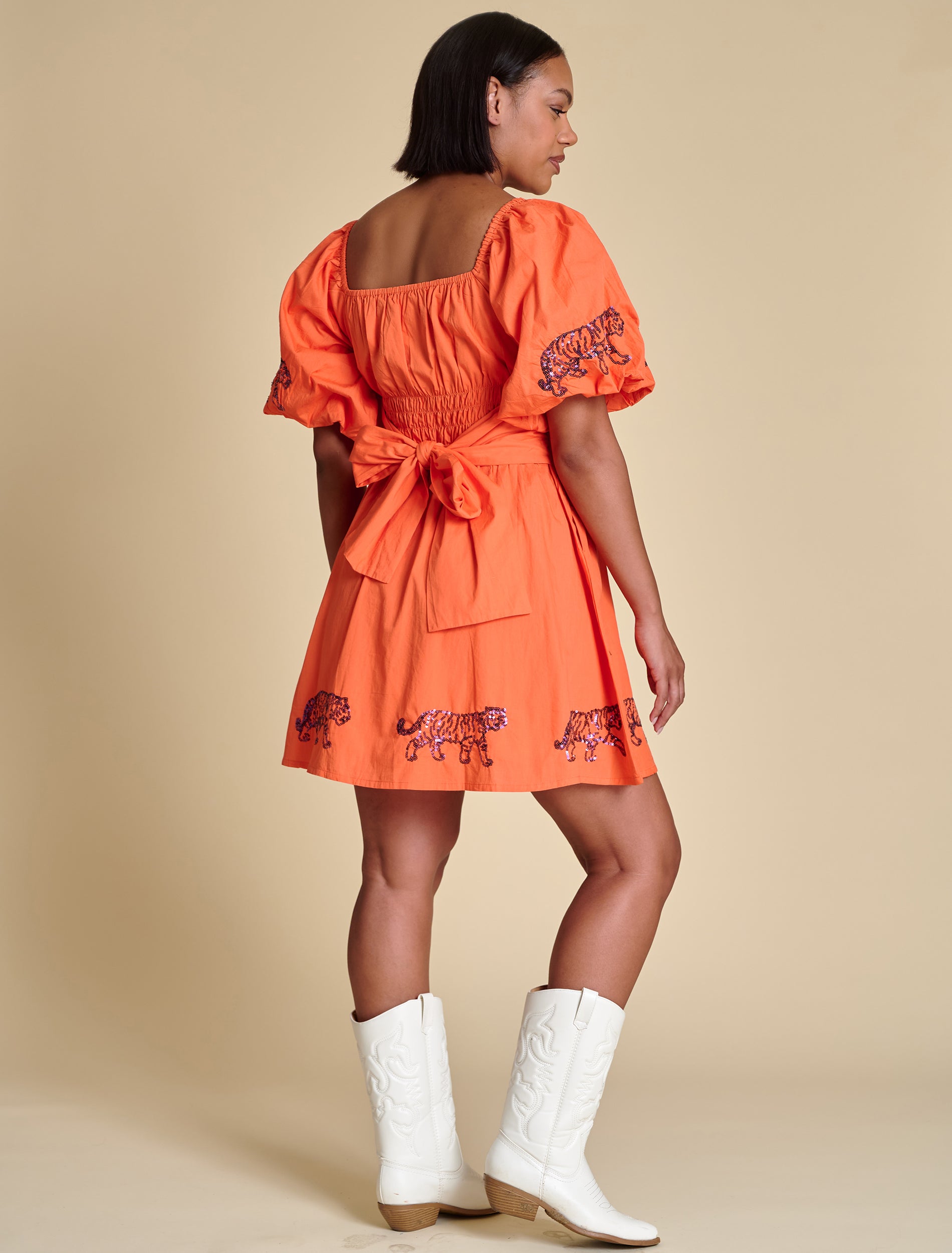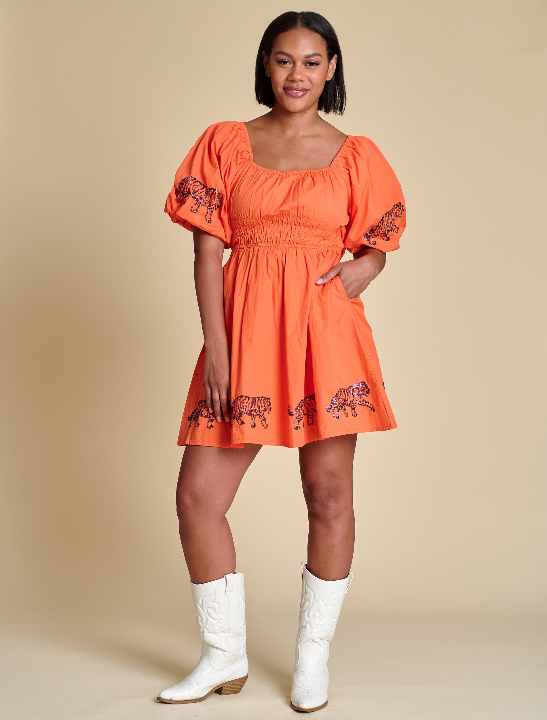 This puff sleeve mini dress features elastic smocking at the chest, a flattering A-line shape, and sequined logo placements at the hem and sleeves. A functional tie at the back adds a sweet finishing touch. We love it styled with trendy sneakers for a flirty casual look, or with cowboy boots for a dash of Southern charm.