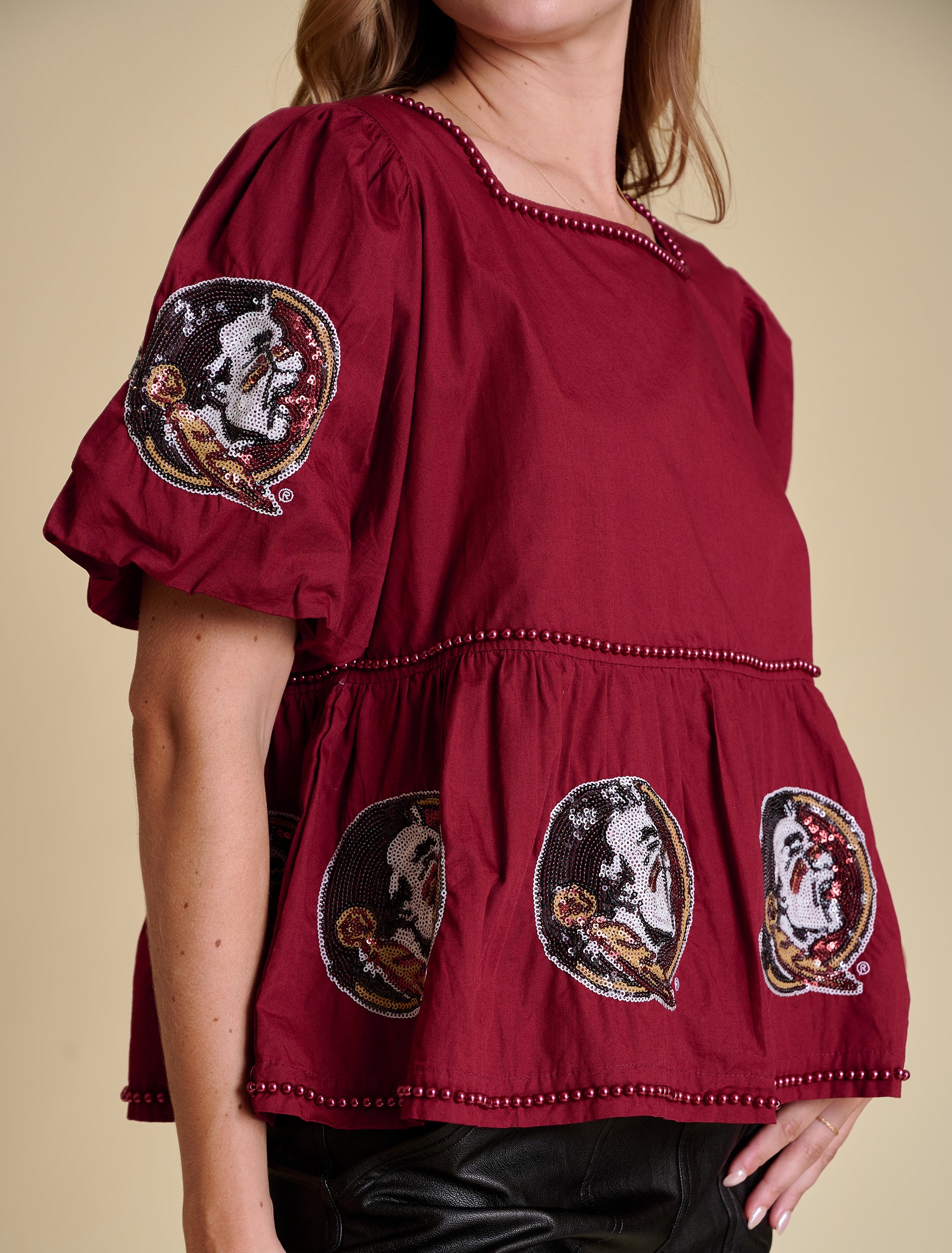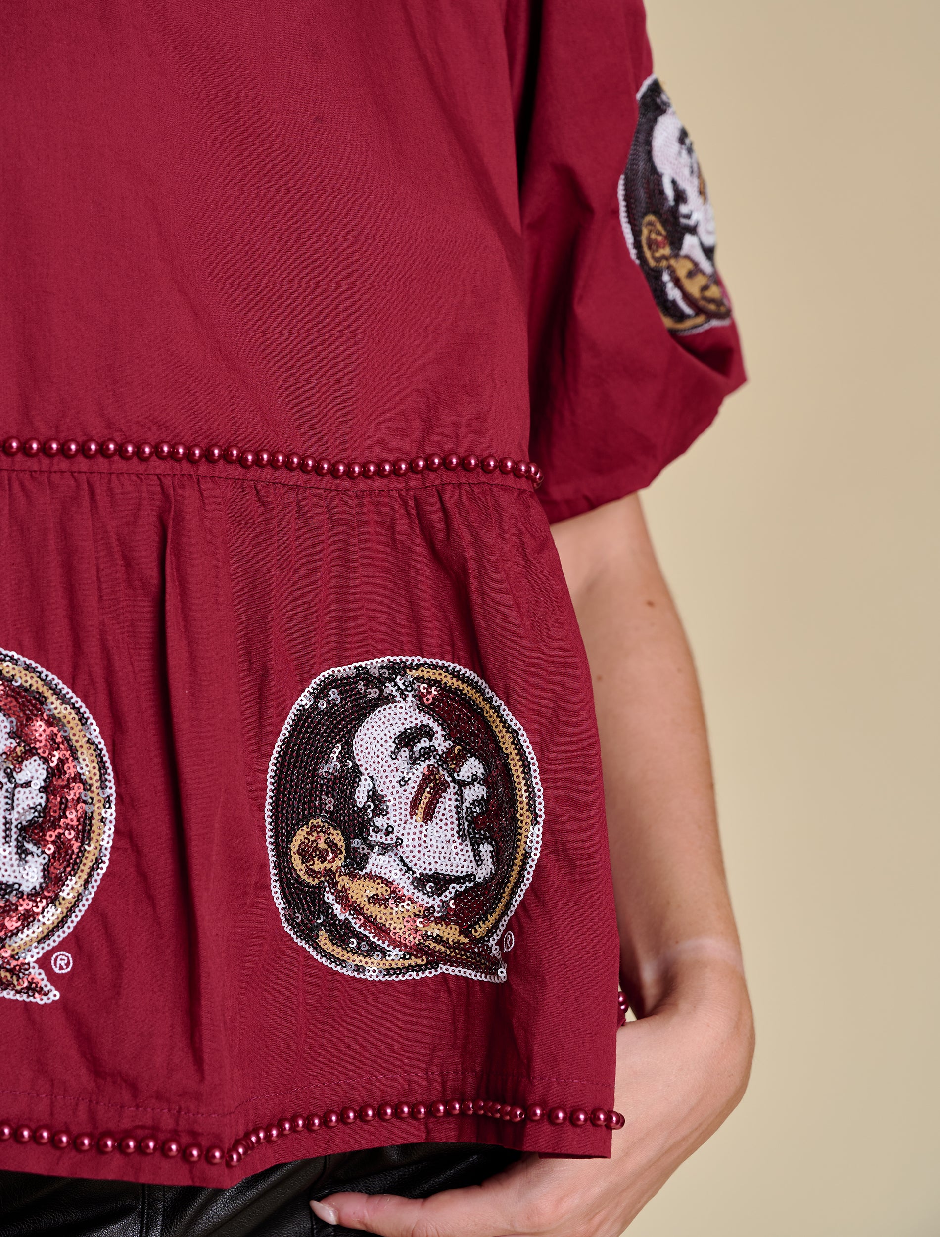 This peplum silhouette is crafted from crisp cotton poplin and finished with pearl embellishments and full sequin logos—perfectly balancing sweet and statement. The voluminous puff sleeves and cinched waist create a flattering shape. Style it with high-rise denim and a strappy heel, or wide-leg trousers for a trend-forward moment.