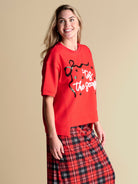 Bring subtle shimmer to your seasonal wardrobe with this holiday casual top. This piece elevates any look with an oversized silhouette and high-low hemline, draping beautifully for movement and dimension, while the cover stitching creates subtle texture. The glitter script piping and sequined accents provide signature shimmer, making it a standout piece for seasonal gatherings. Style it with tartan pants, skirts, or festive layers for a polished, celebratory look perfect for holiday brunches and parties.
