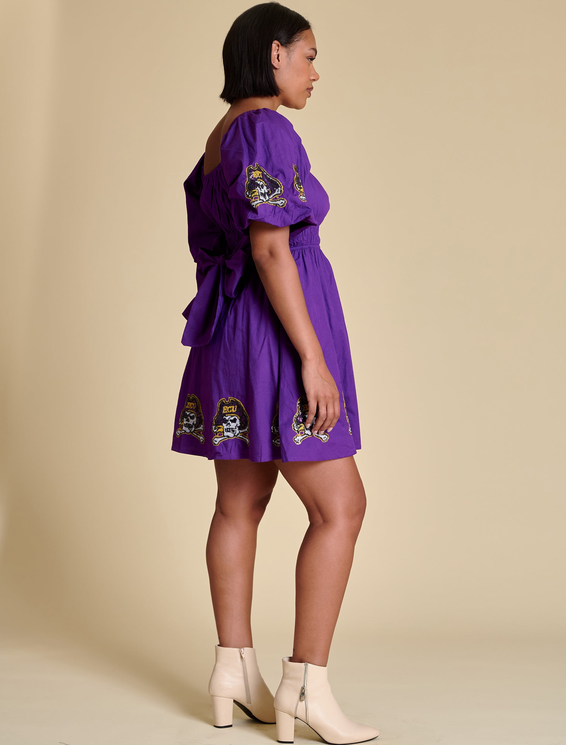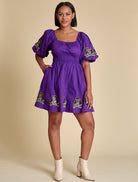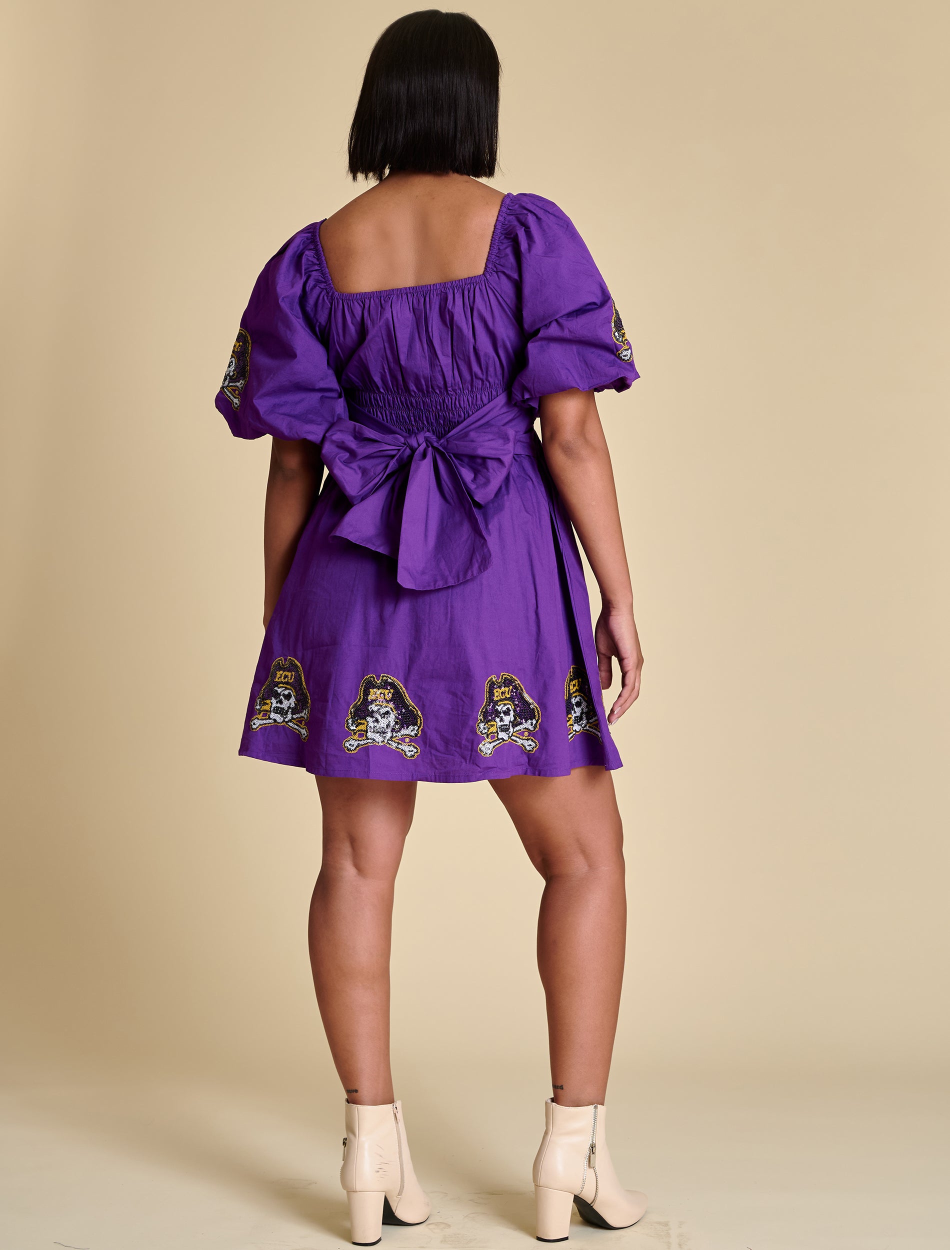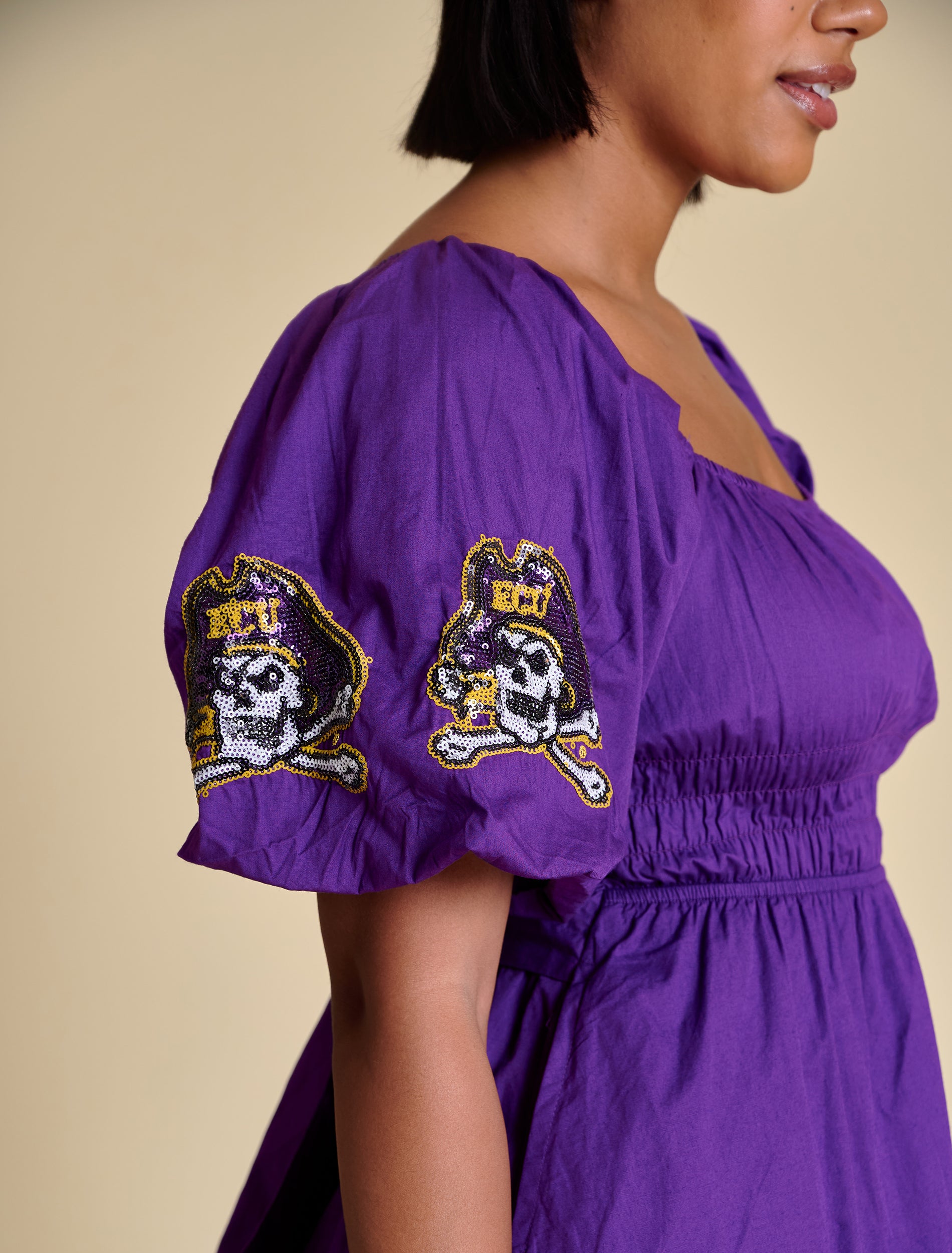 This puff sleeve mini dress features elastic smocking at the chest, a flattering A-line shape, and sequined logo placements at the hem and sleeves. A functional tie at the back adds a sweet finishing touch. We love it styled with trendy sneakers for a flirty casual look, or with cowboy boots for a dash of Southern charm.