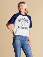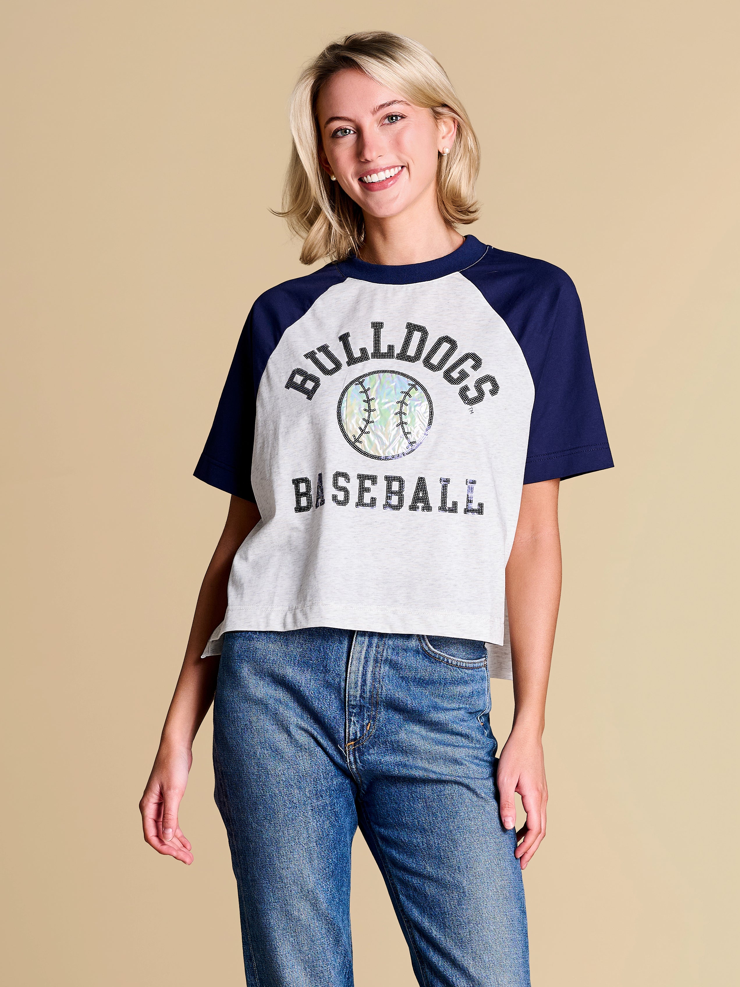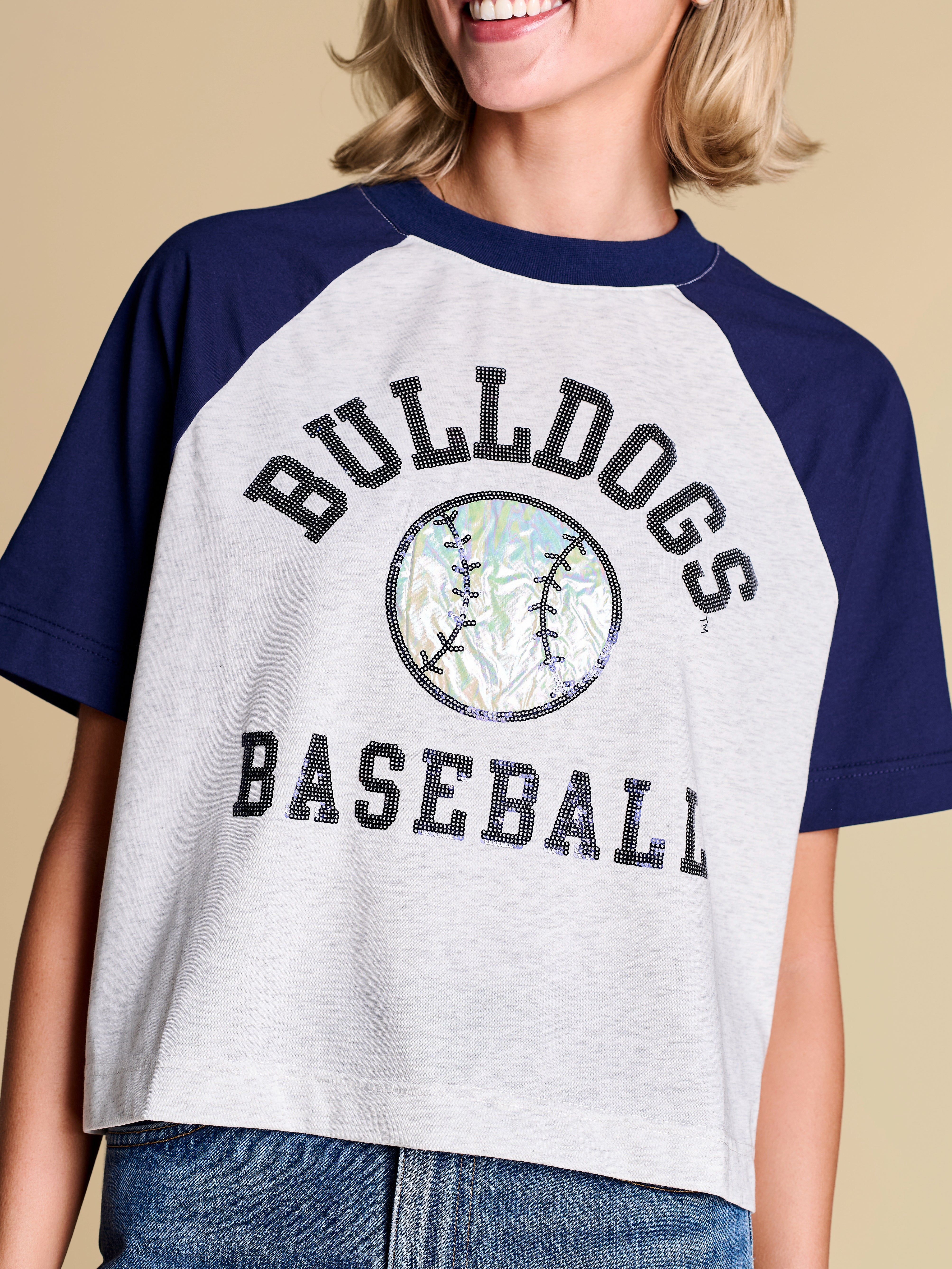 A classic raglan tee that brings all-star energy, finished with a holographic appliqué baseball motif and sequin accent details. The perfect blend of statement and casual, this piece deserves a spot in your starting spring lineup.