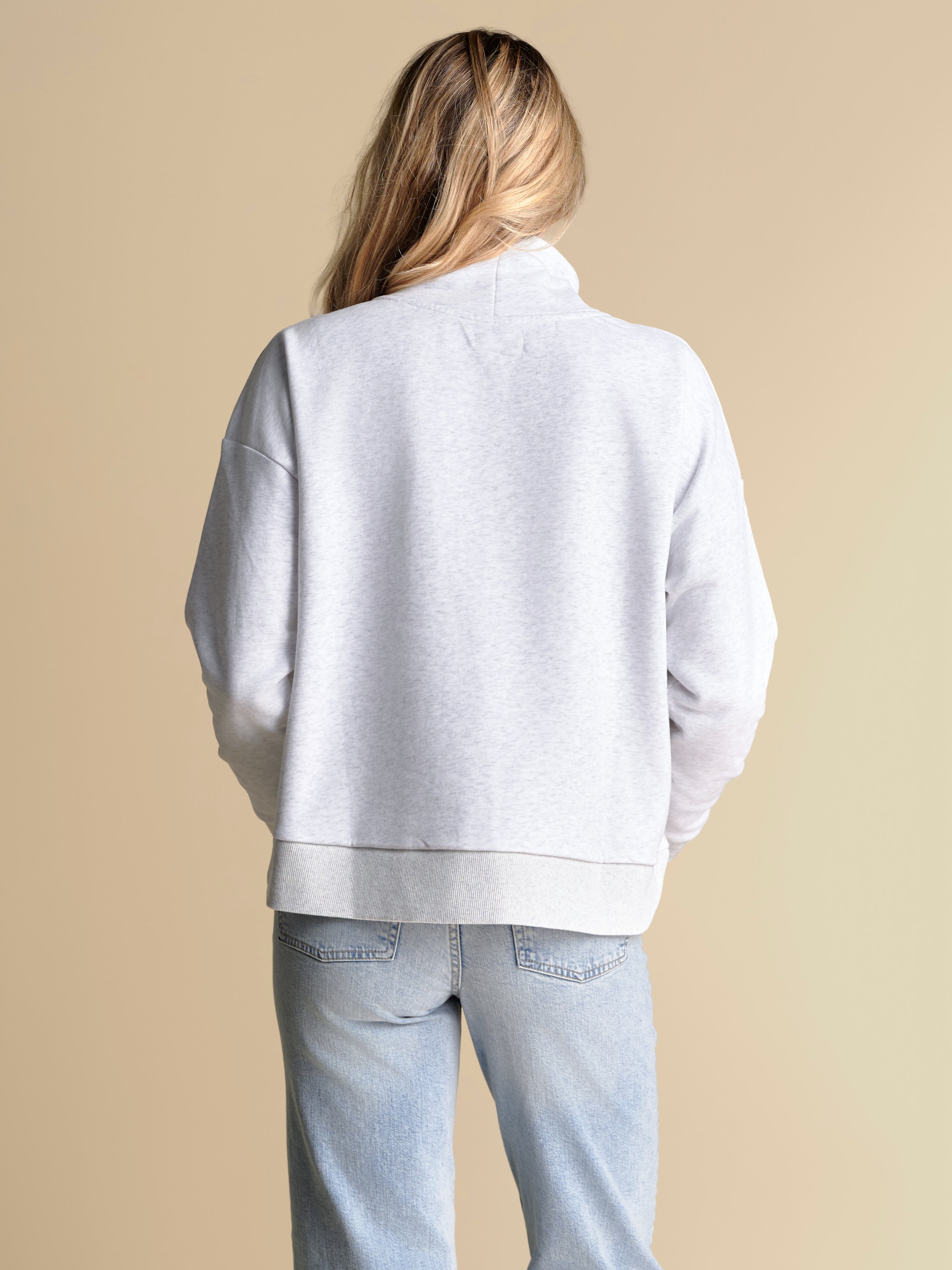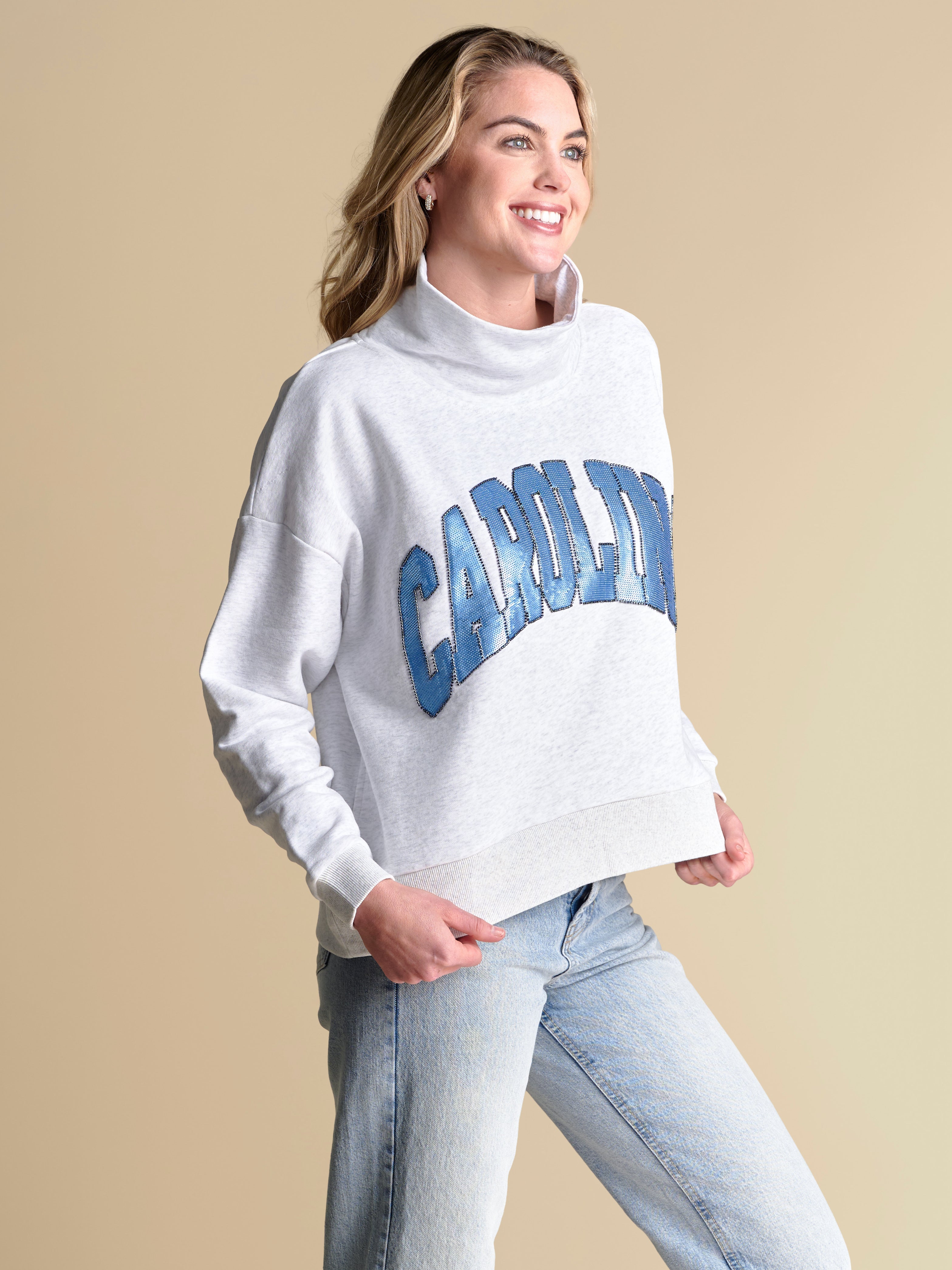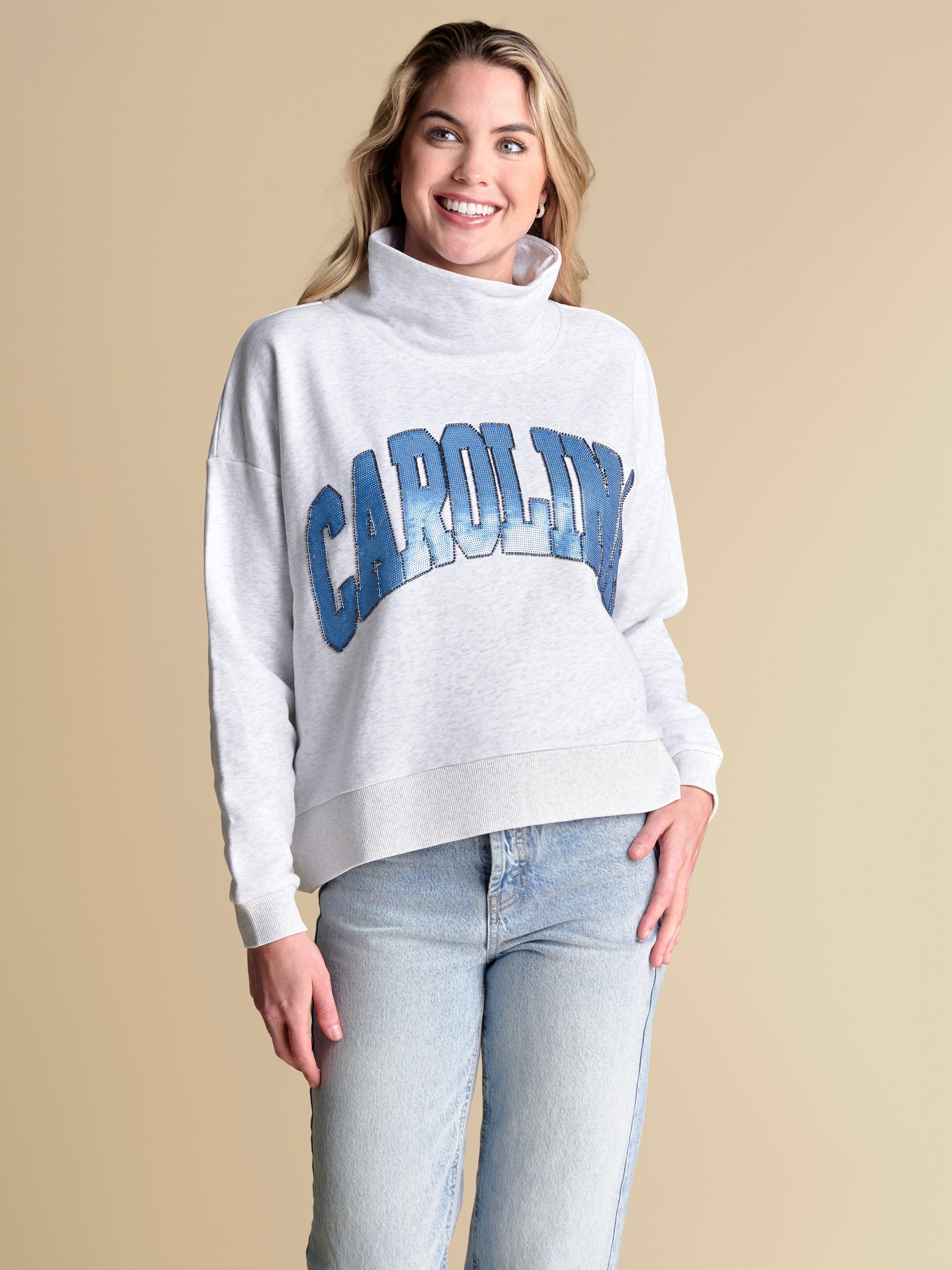 Designed with an oversized fit and hidden pockets at the side seams, this trendy mockneck sweatshirt is equal parts sporty and elevated. It blends everyday ease with playful details, featuring a sequin wordmark logo outlined in beading for just the right amount of shimmer. We’re styling this piece with a pair of colorful, printed jeans and sneakers for the ultimate game day statement look.