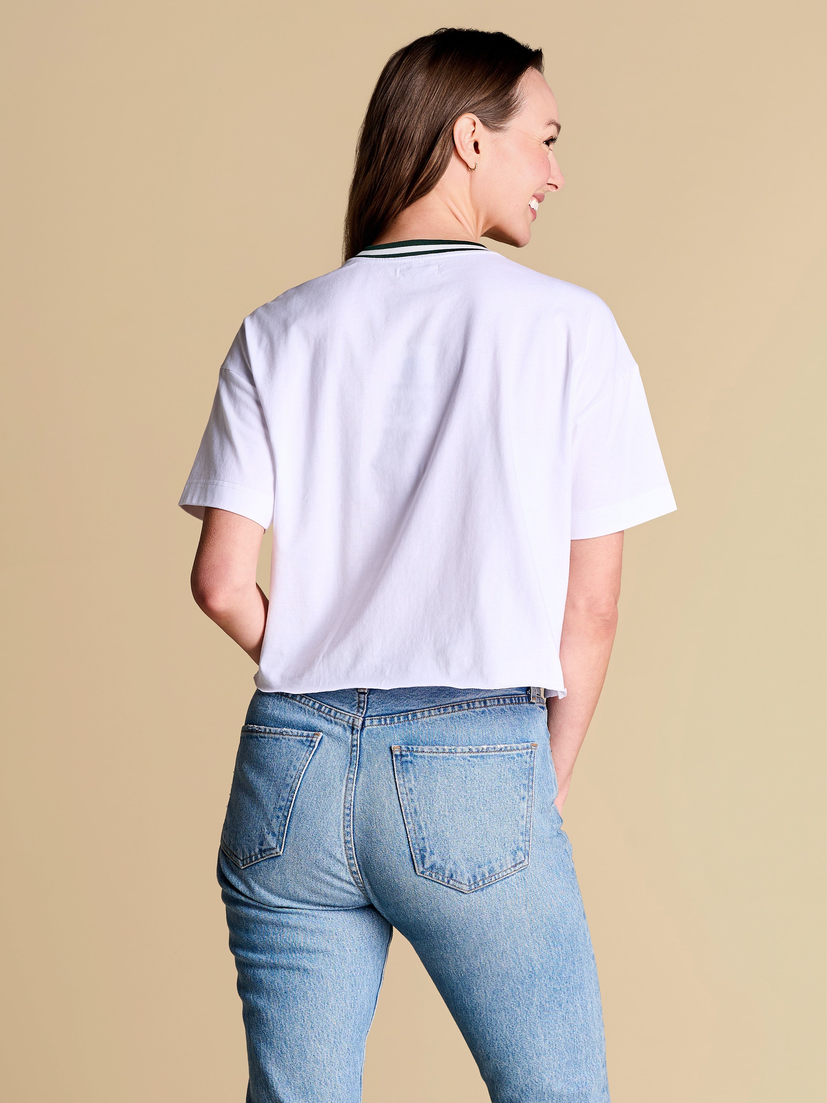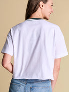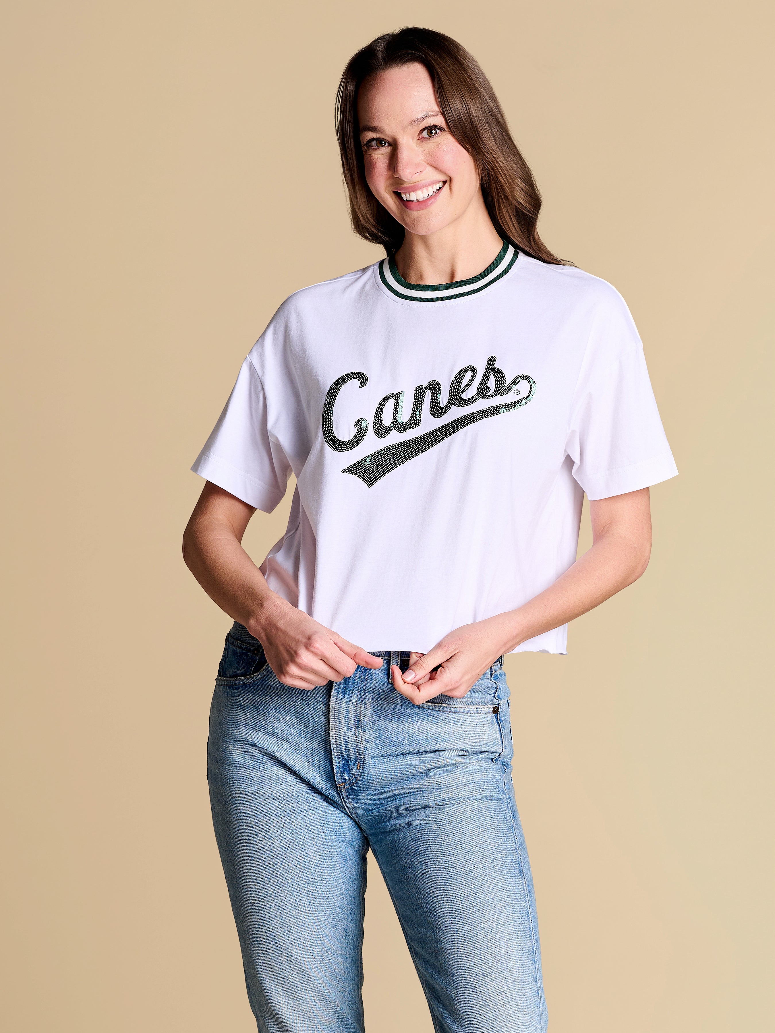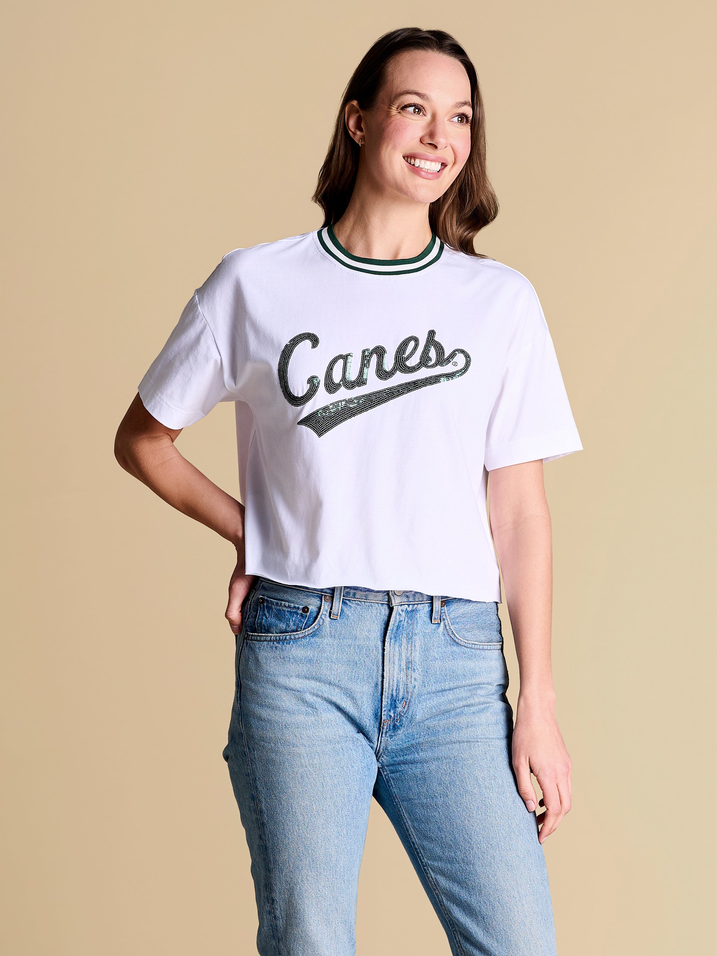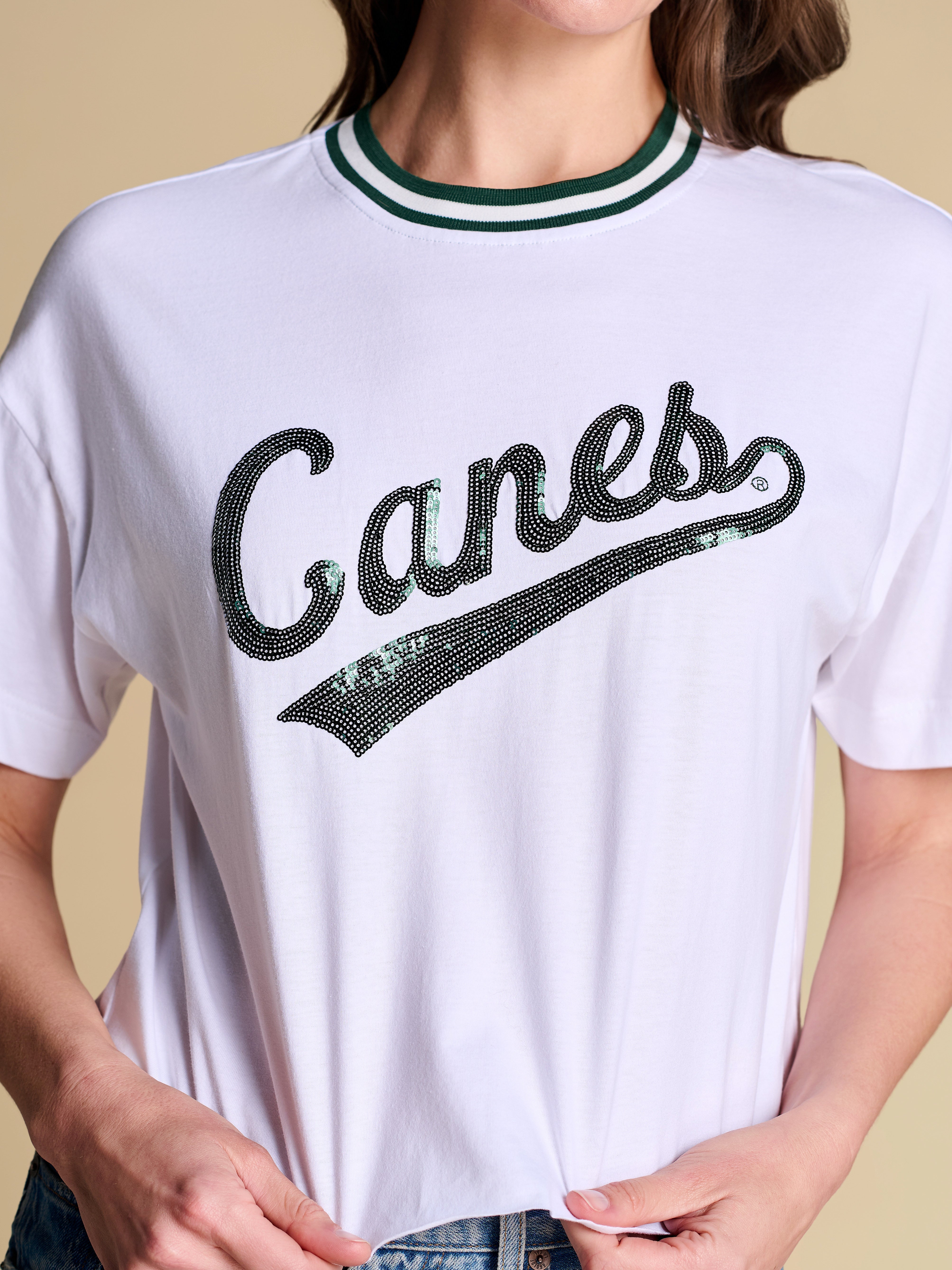 A baseball-inspired boxy tee with vintage varsity energy, featuring a sequin team logo and retro striped rib neckline. Easy, eye-catching and endlessly wearable, it’s the throw-on favorite you’ll want to rep from game time to downtime.
