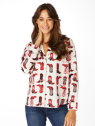 The Boots Button-Up blouse features cowboy boots in your favorite team’s colors and school logo. The scatter print on this blouse shows off your modern rodeo style.  This shirt has so many possibilities and can be worn open over a tank, buttoned up and tucked into jeans, or tied at the waist with jean shorts.