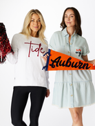 This Denim Dress is perfect for game day! With a collared V-neckline, cuff sleeves, pockets, and raw edge hem, you can’t go wrong!  Proudly cheer on your team with your team embroidered on the pocket in school colors.  Pair with white sneakers or boots and you are ready to go!