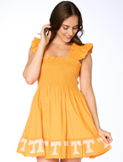 Elevate your game day wardrobe with our brand new smocked sequin dress! With ruffled shoulders, pockets, and a bra-friendly design, this dress will quickly become your go-to for gatherings. This dress is officially licensed so a portion of your purchase directly supports the university.