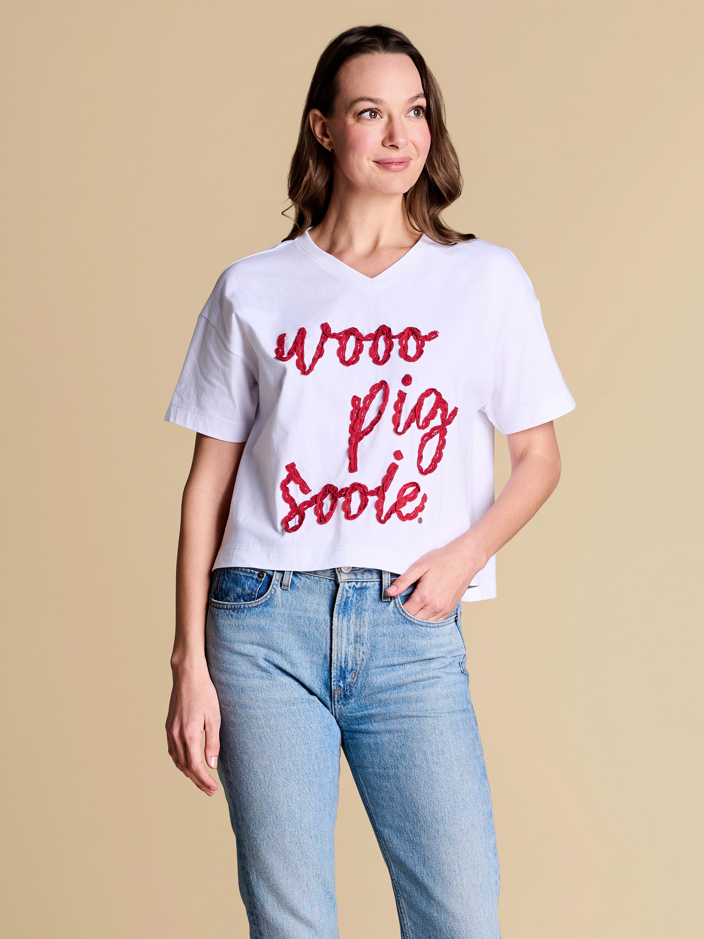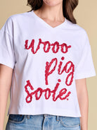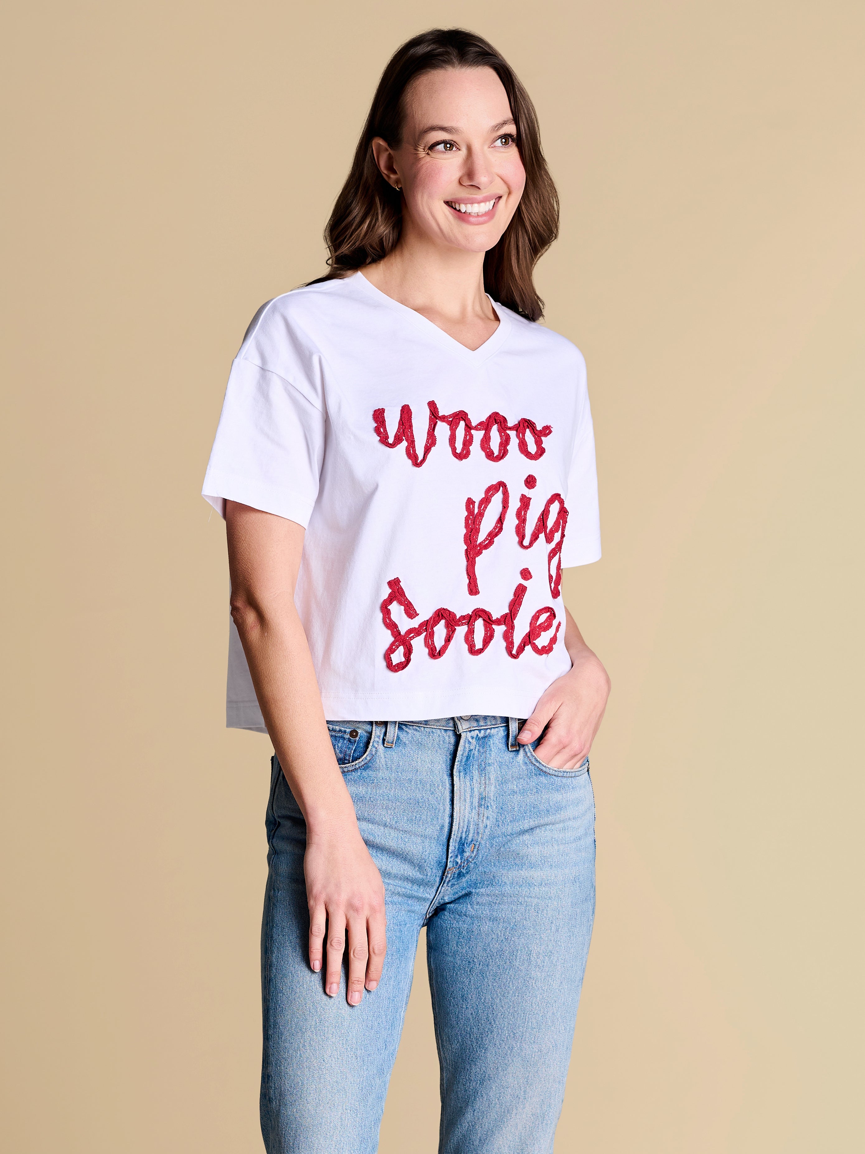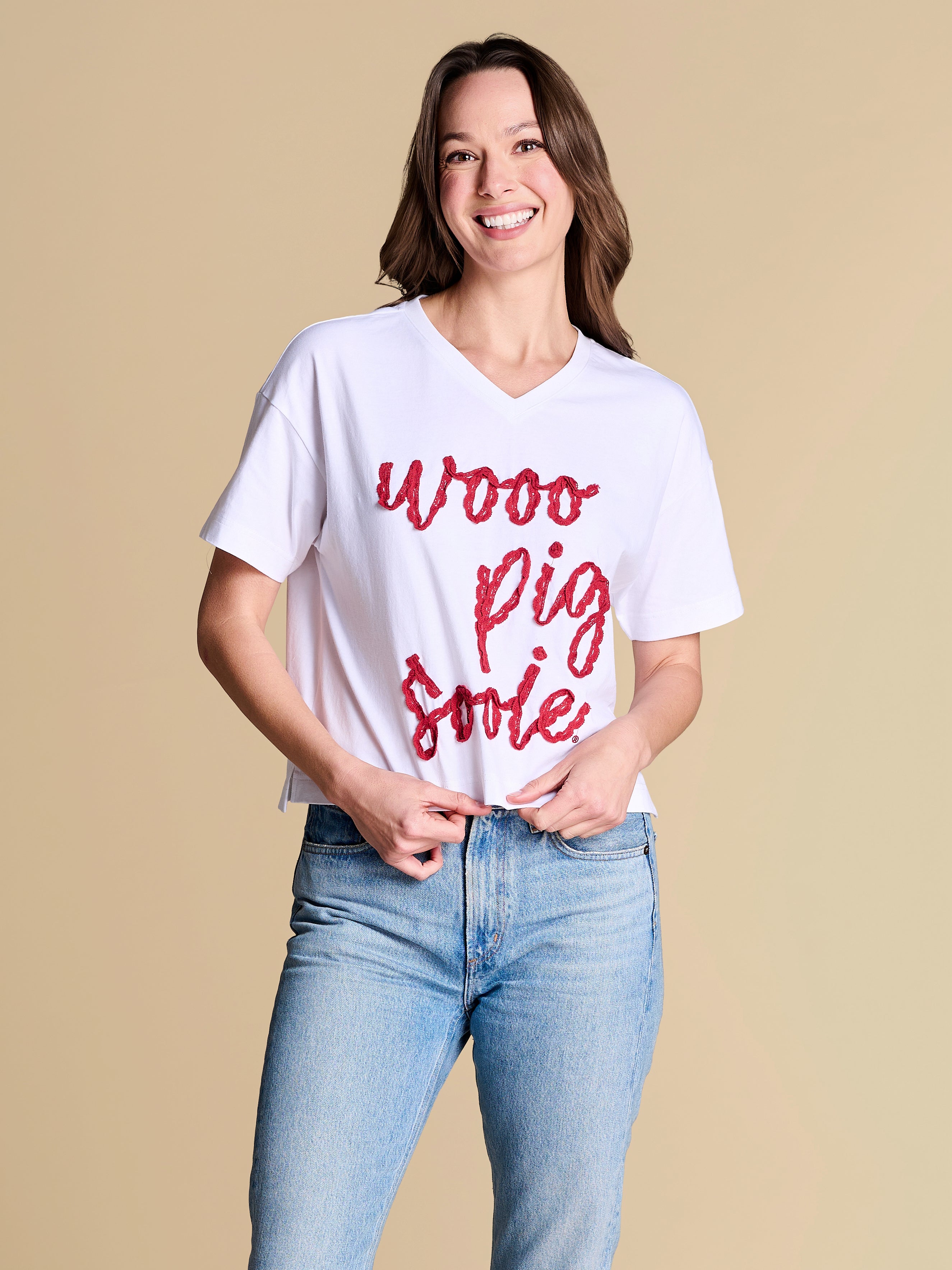 A fresh take on the classic V-neck silhouette, finished with dainty crochet lace script for a feminine twist. A warm-weather favorite you’ll keep on rotation from sunny strolls in the park to cheering in the stands.