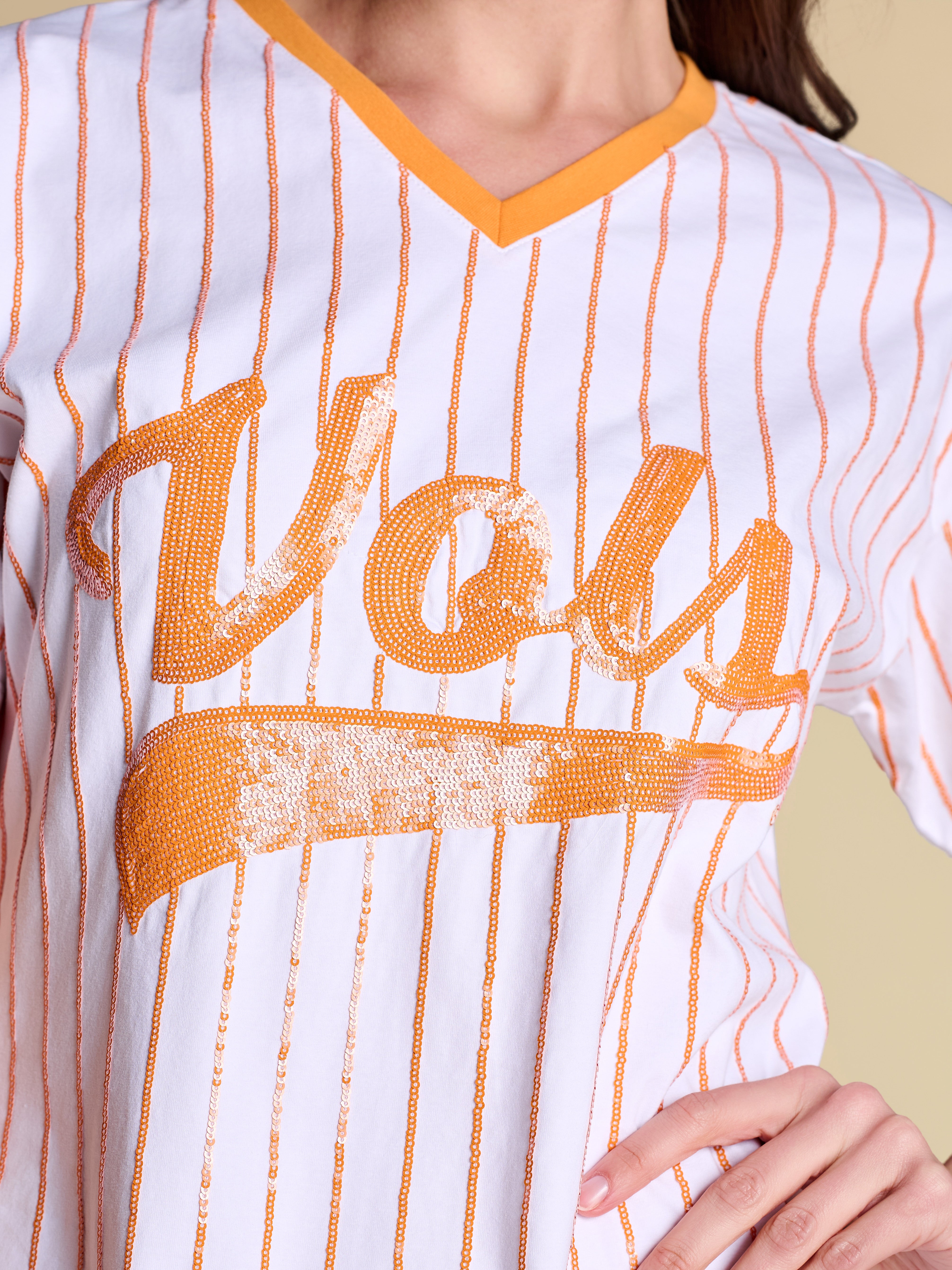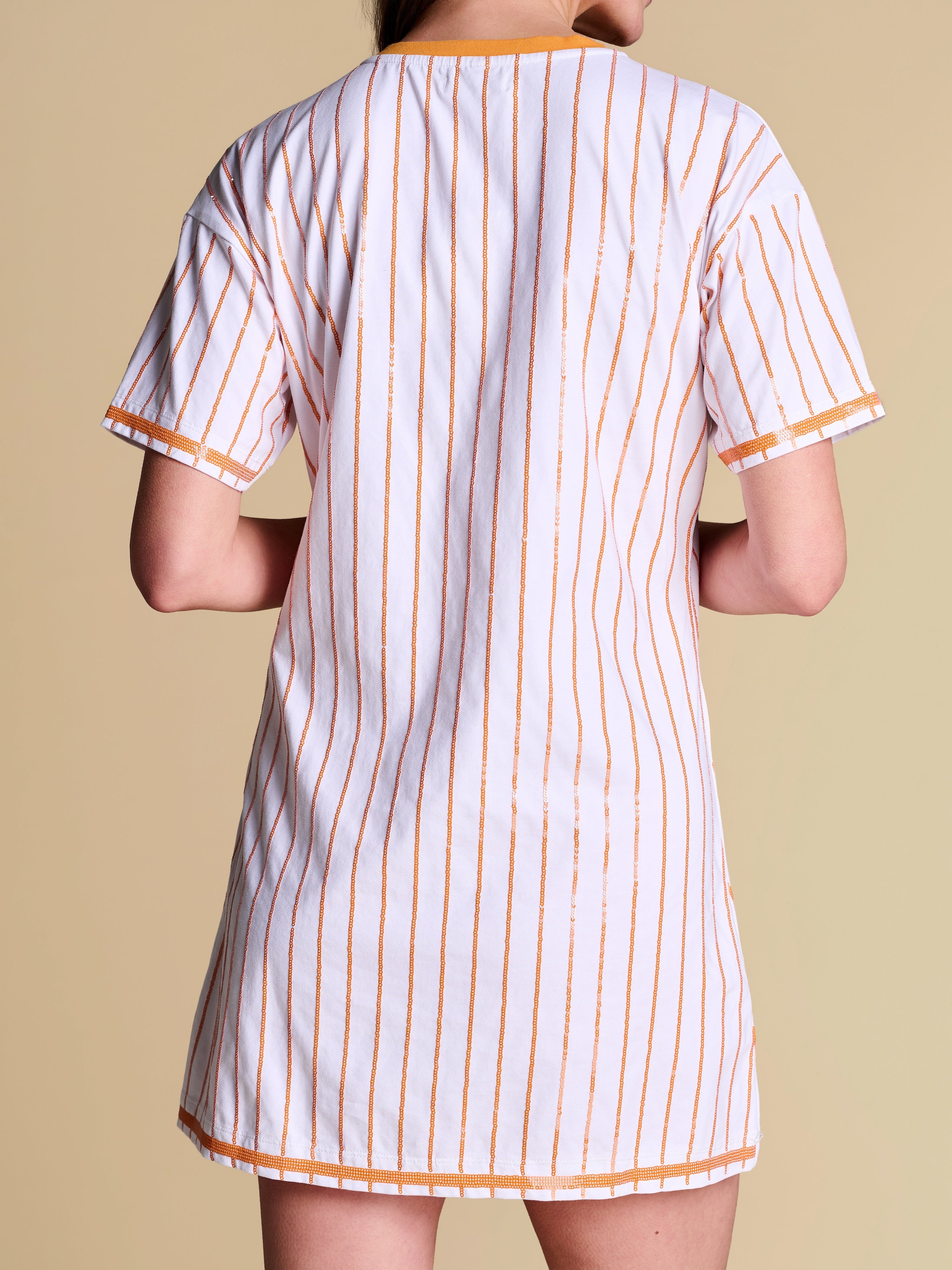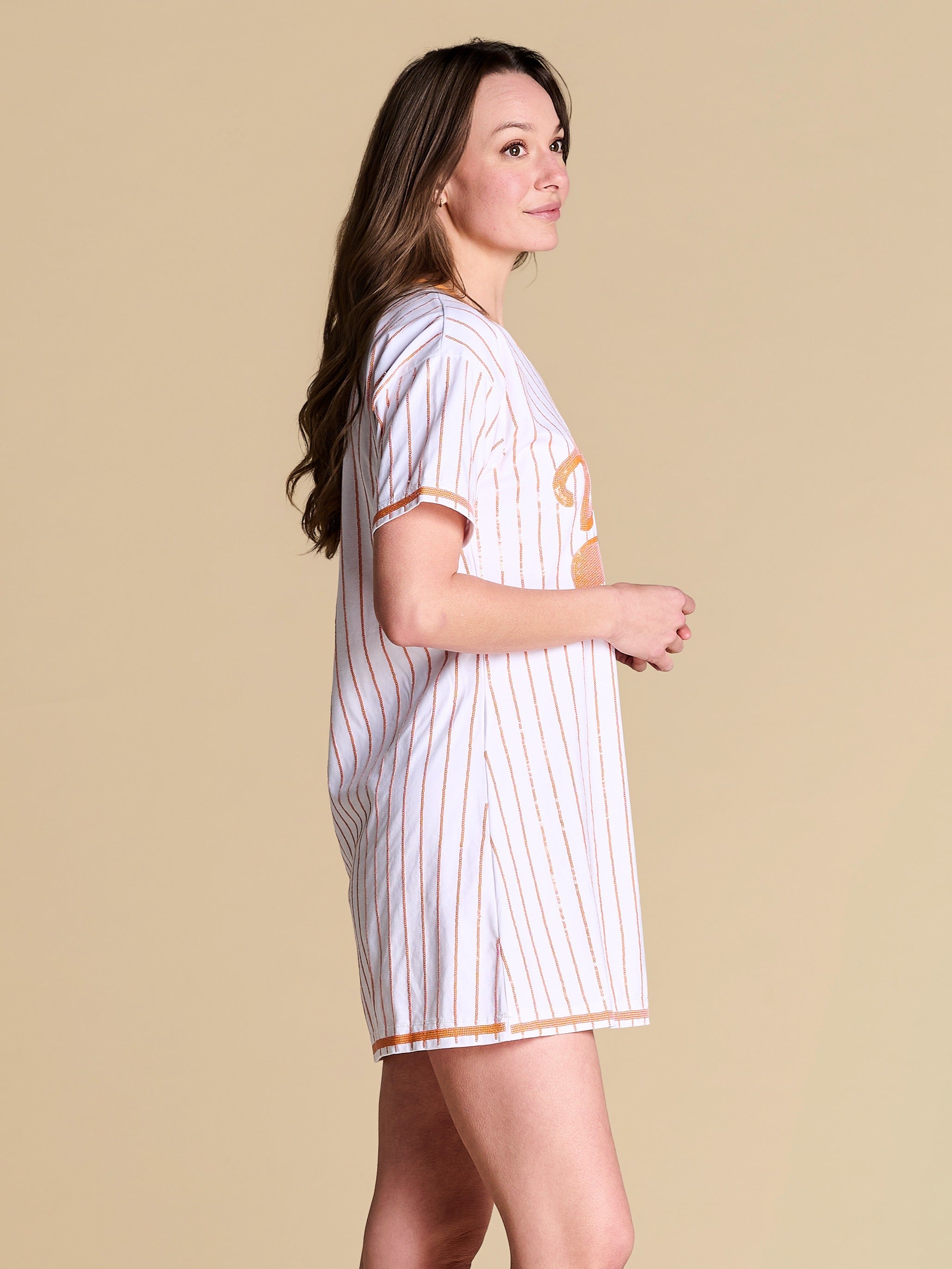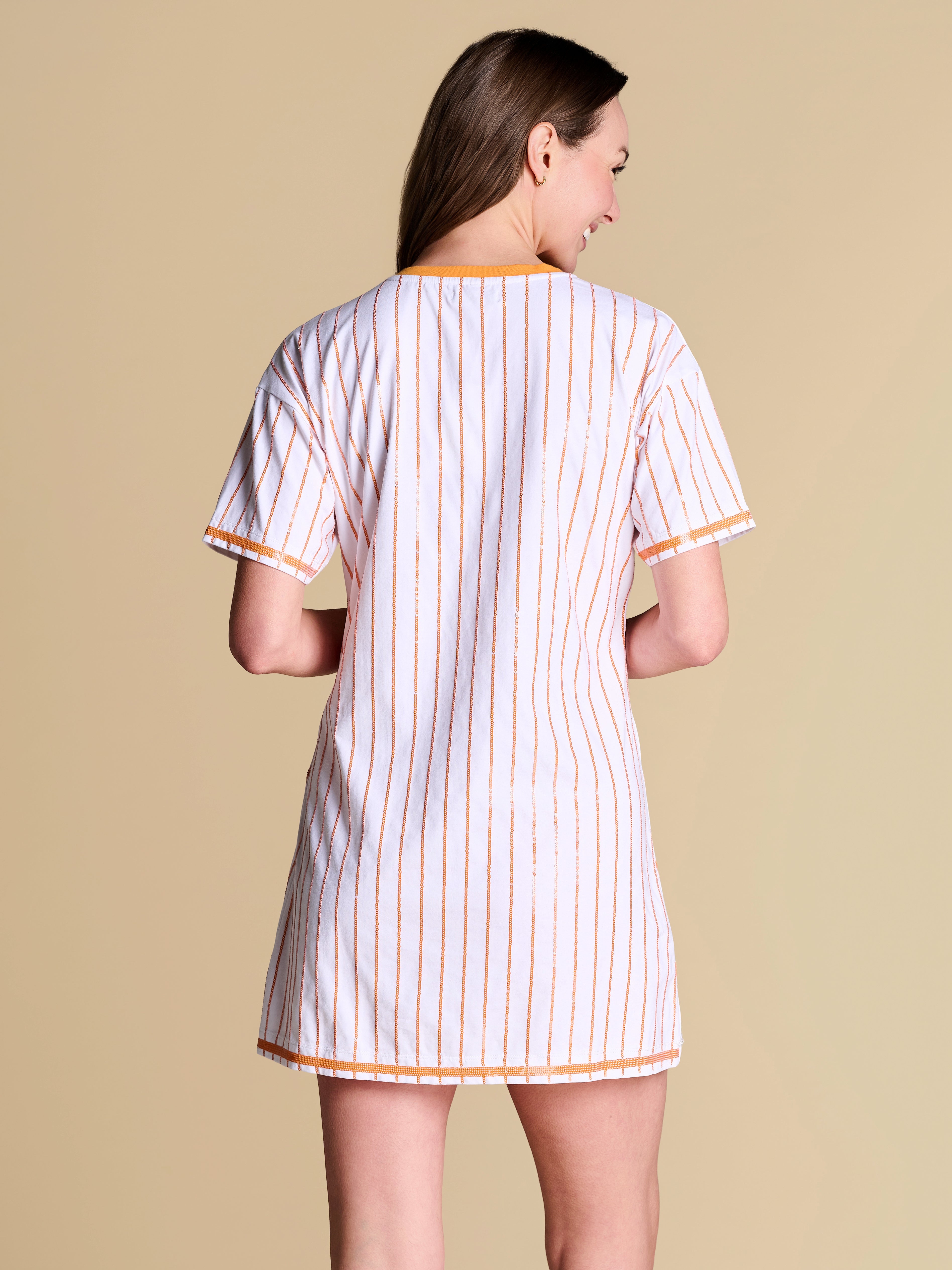 All bases are covered with this relaxed-fit tee dress — a little sporty, a lot statement, featuring a retro contrast V-neckline and standout sequin pinstripes. Feminine and playful, it’s your new go-to spring uniform for making an off-duty statement.