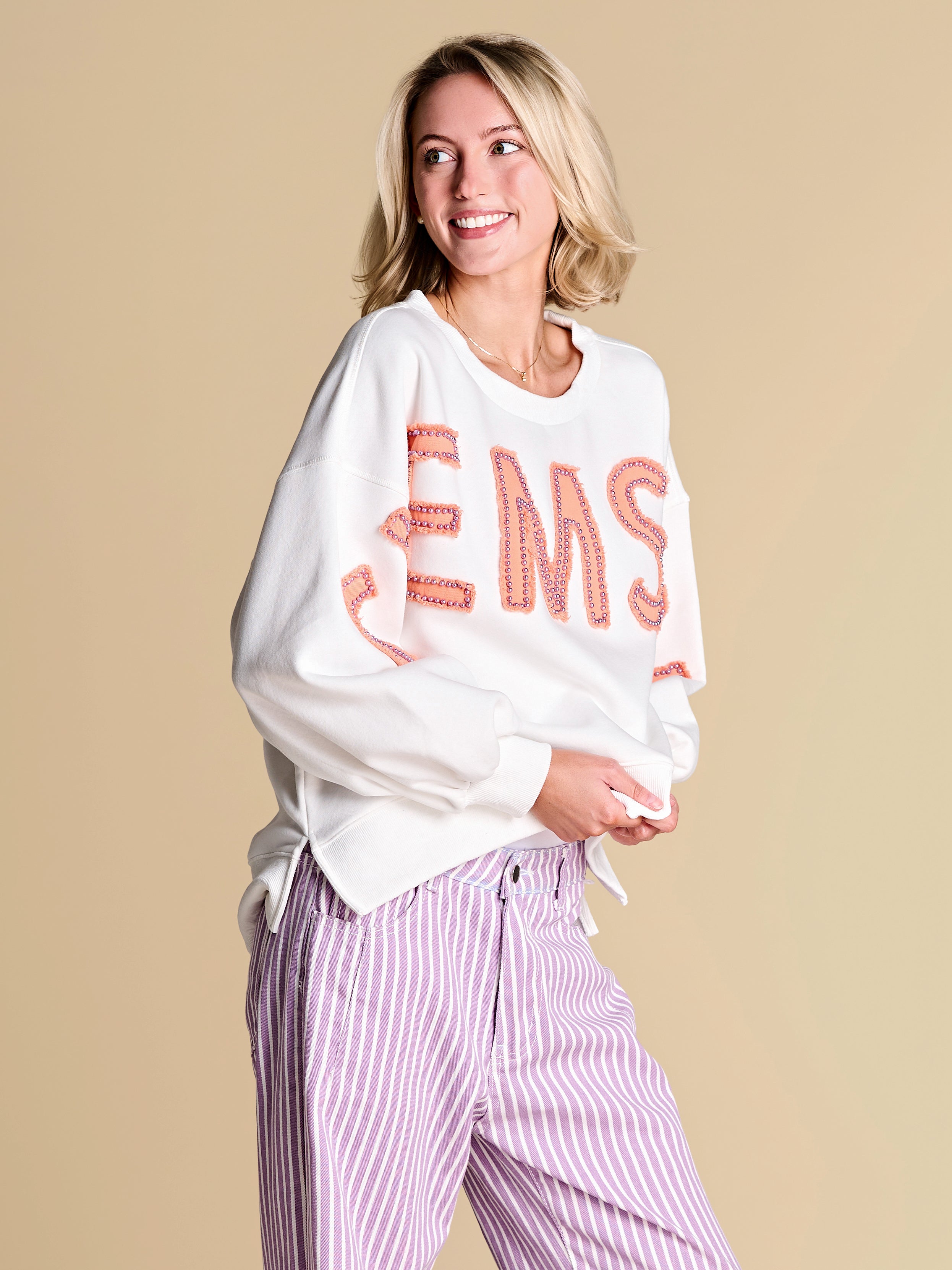 An elevated take on off-duty style, finished with raw-edge appliqué lettering and contrast pearl outlining. A warm-weather staple you’ll reach for on repeat, from slow market mornings to spirited match-day moments.