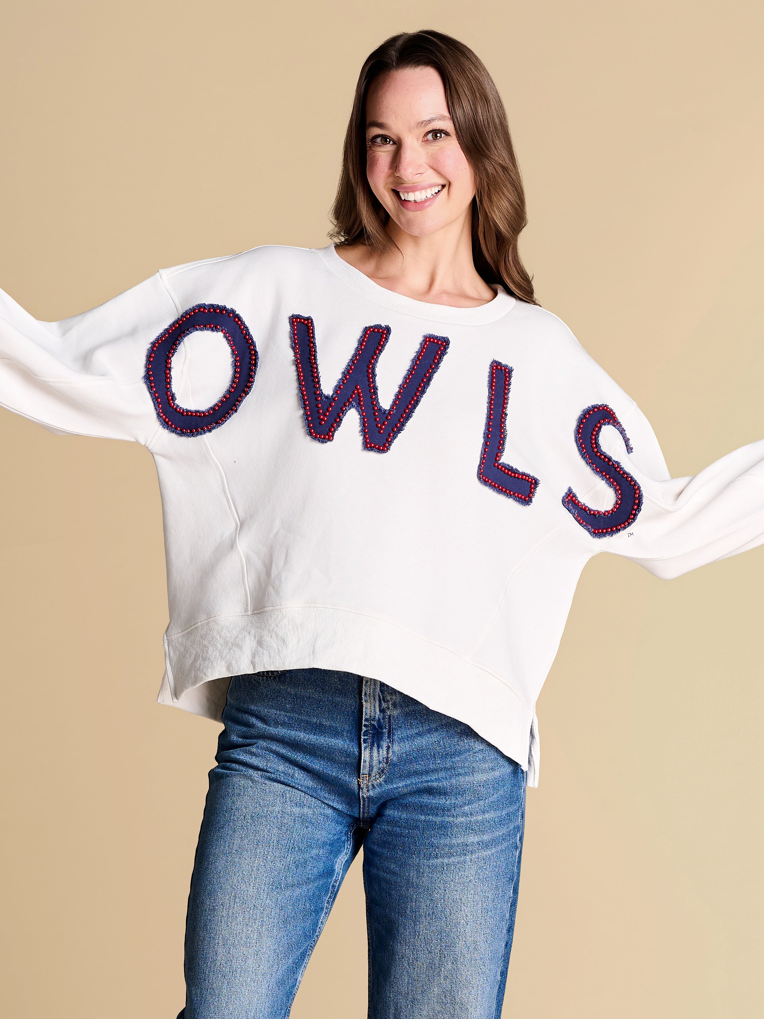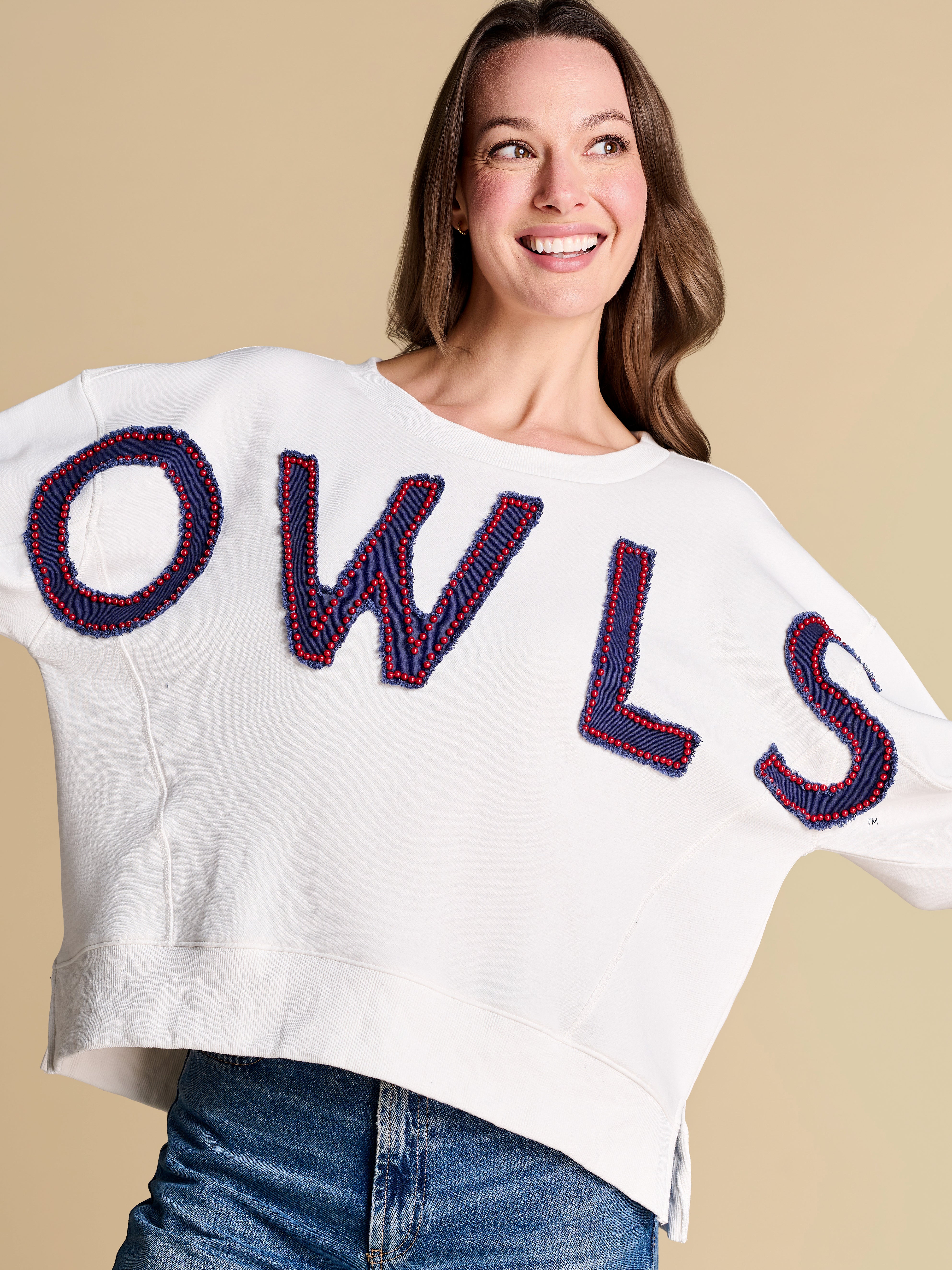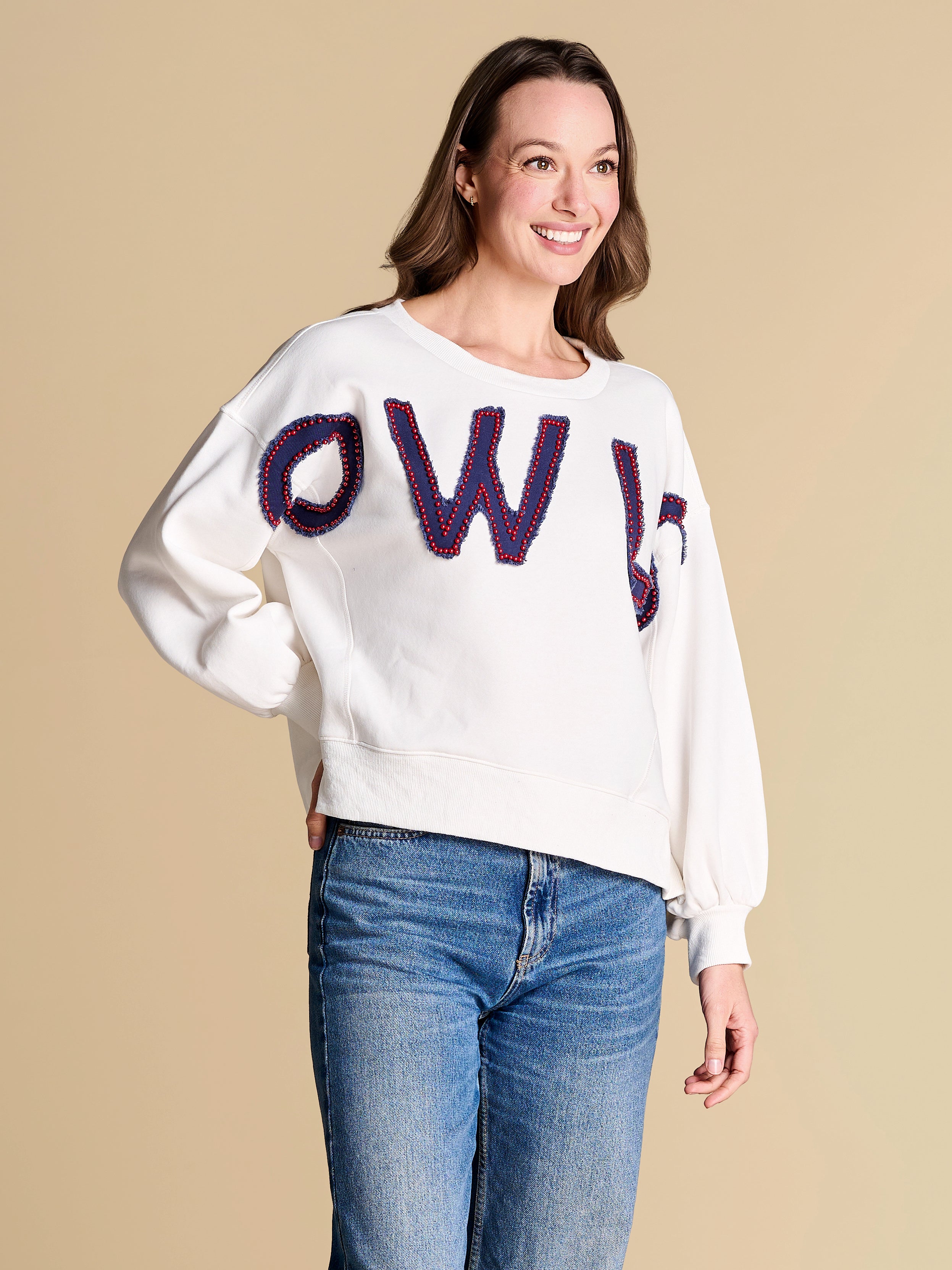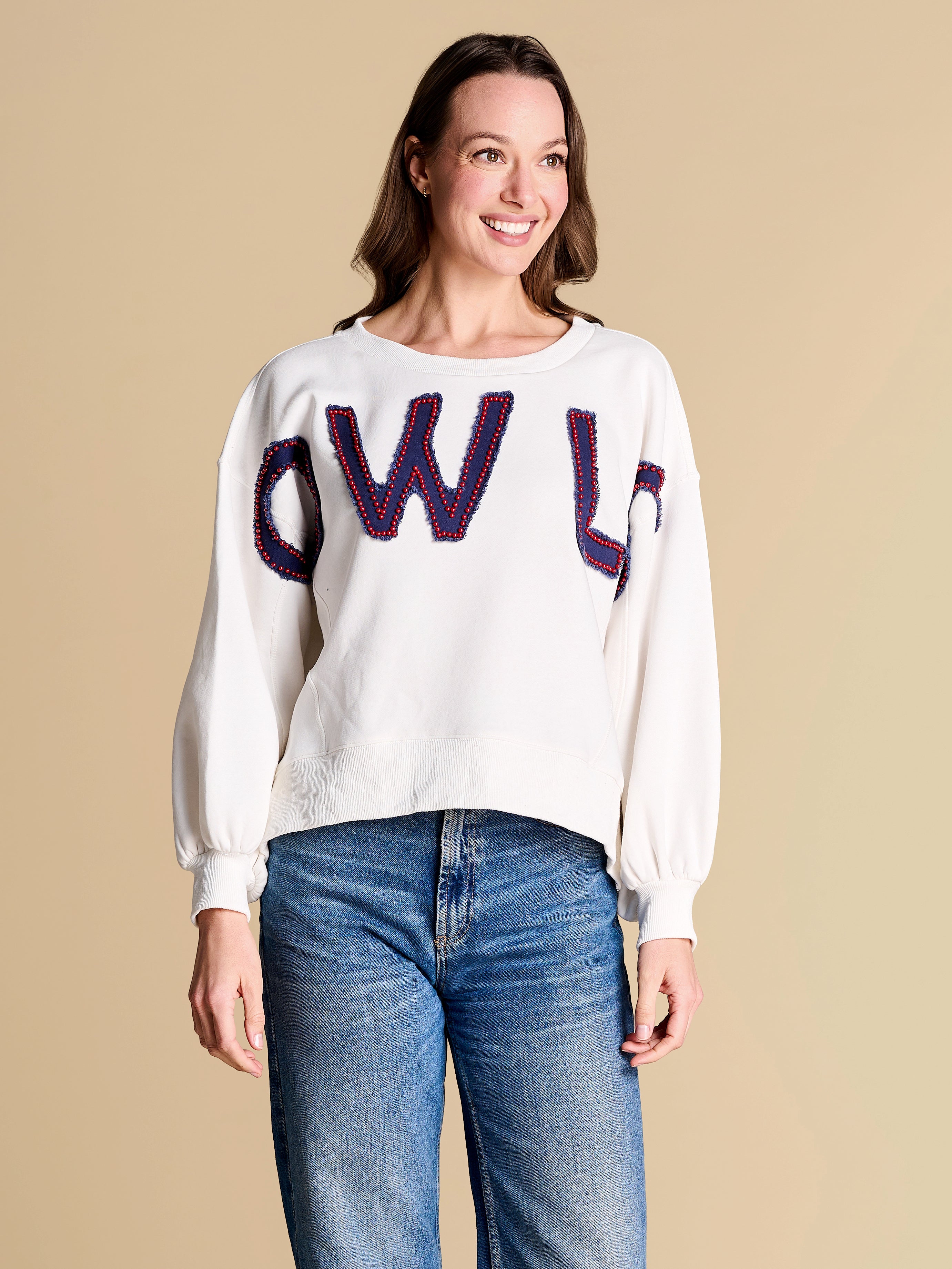 An elevated take on off-duty style, finished with raw-edge appliqué lettering and contrast pearl outlining. A warm-weather staple you’ll reach for on repeat, from slow market mornings to spirited match-day moments.