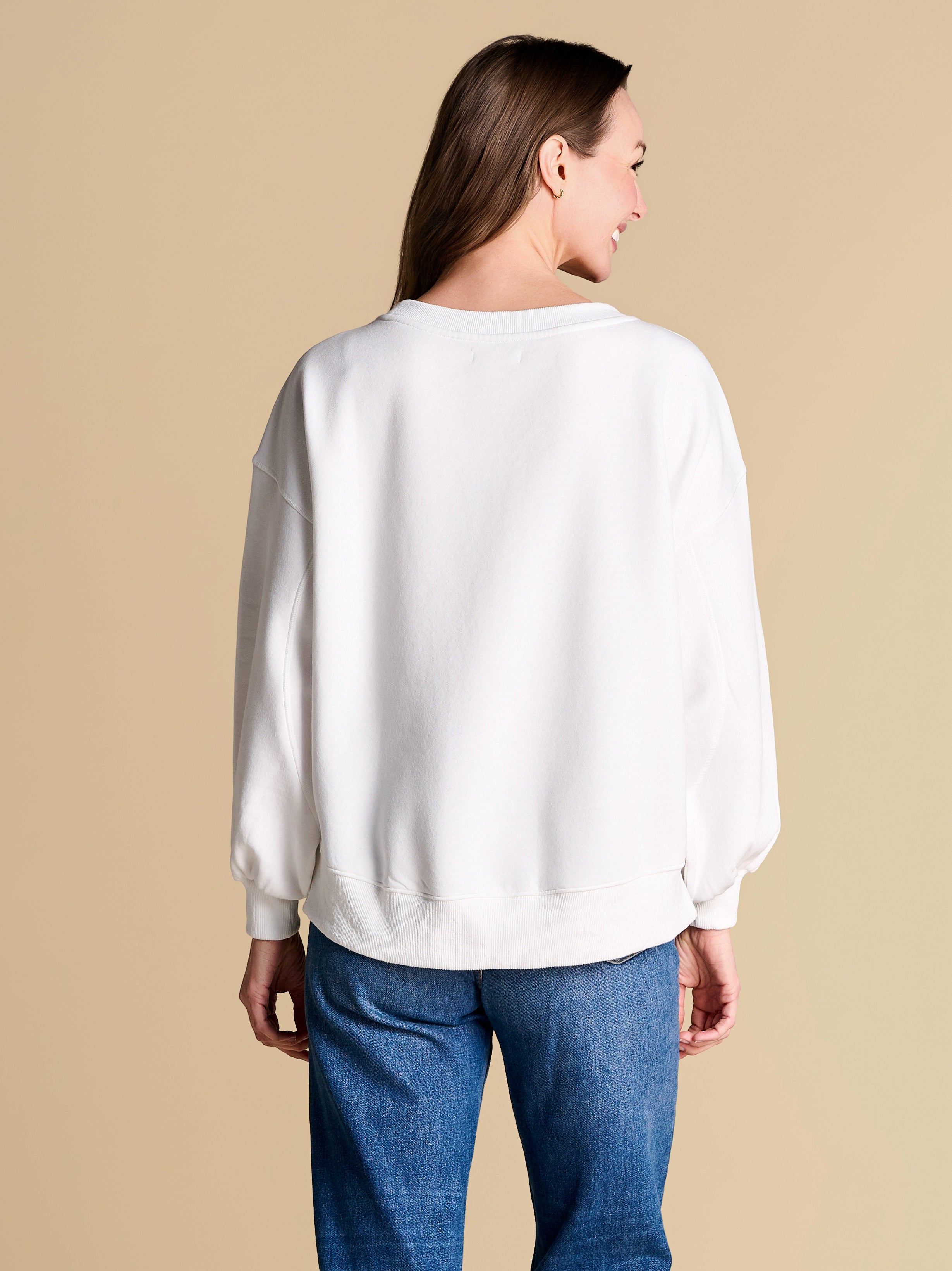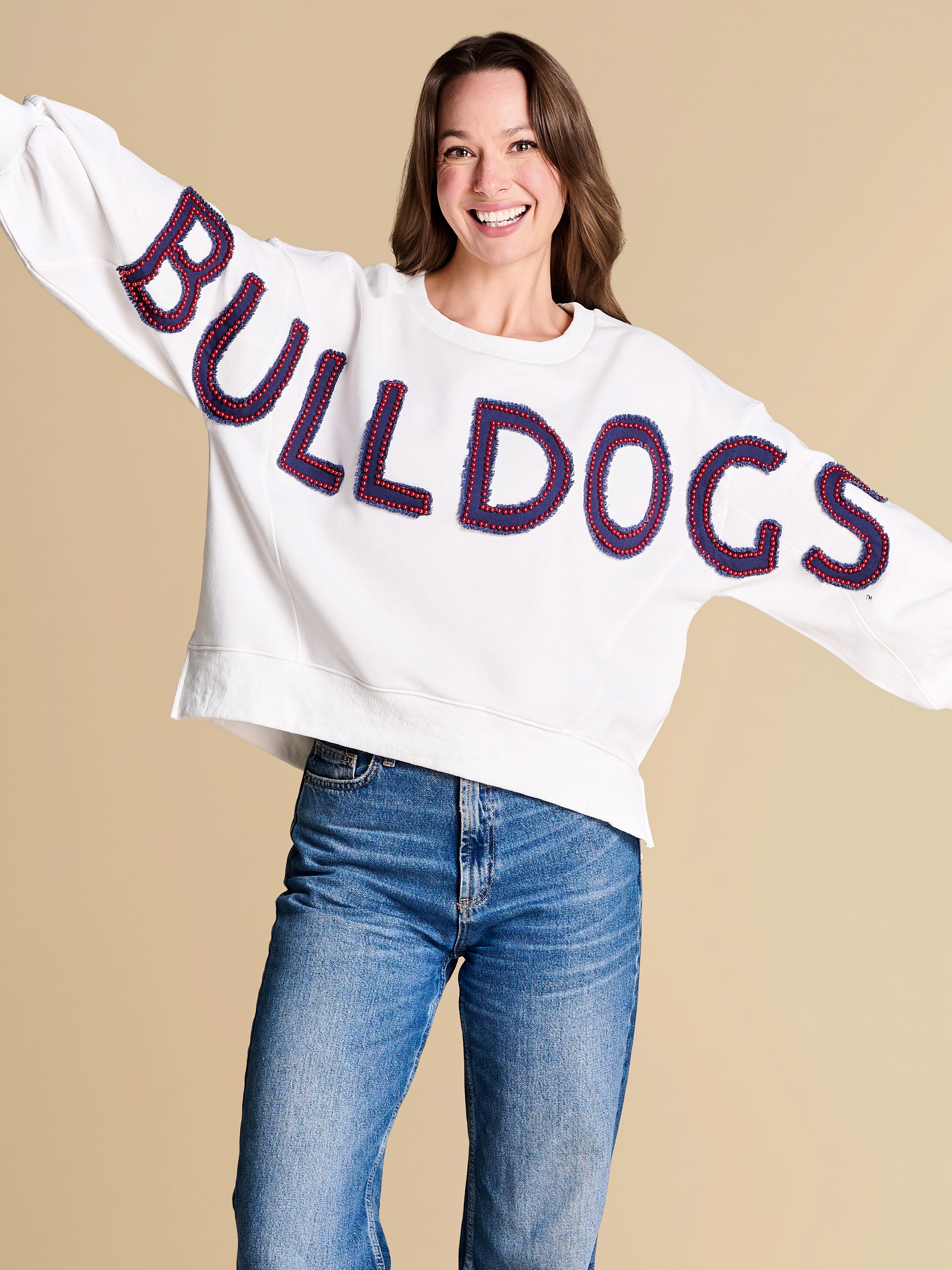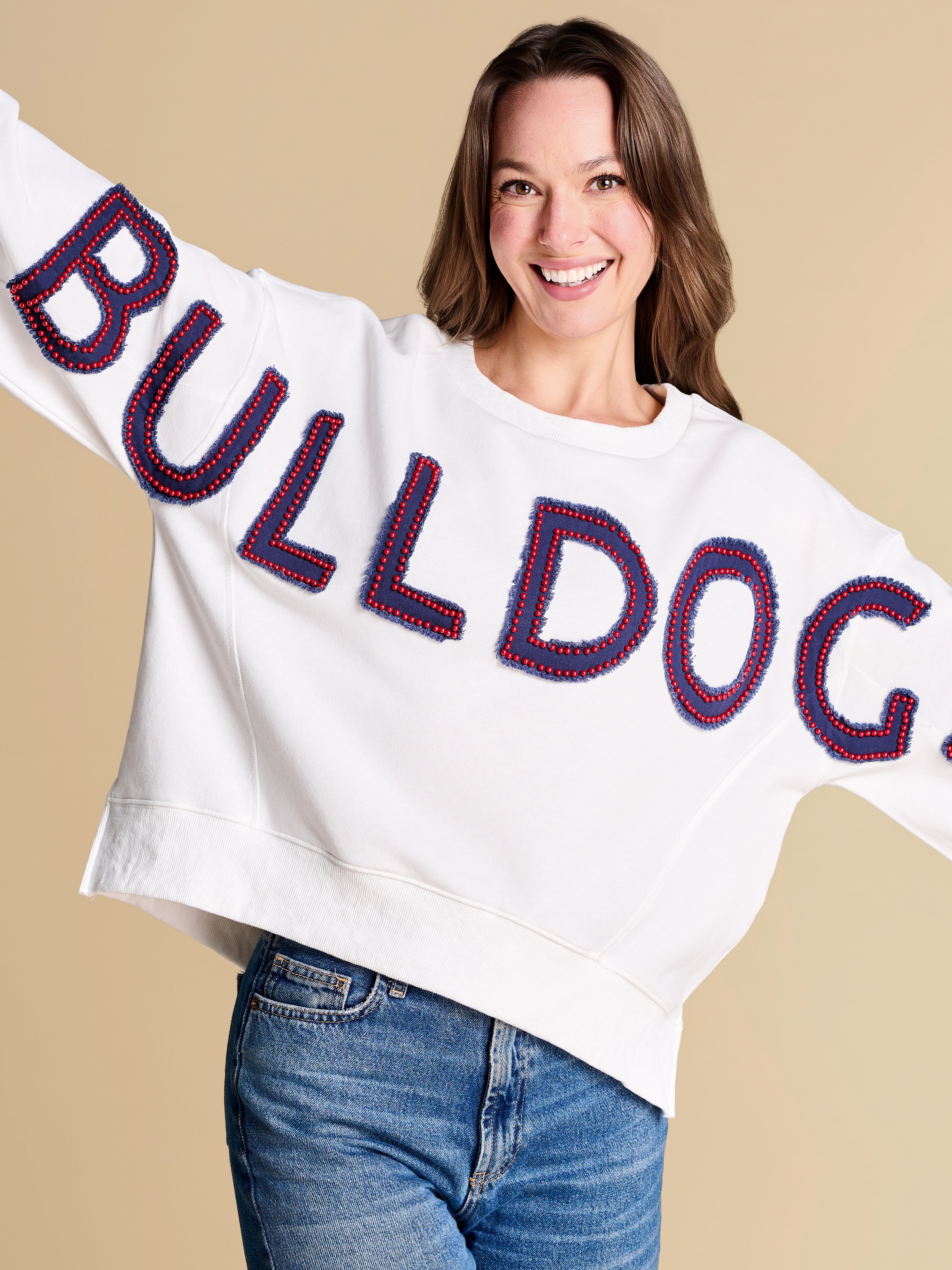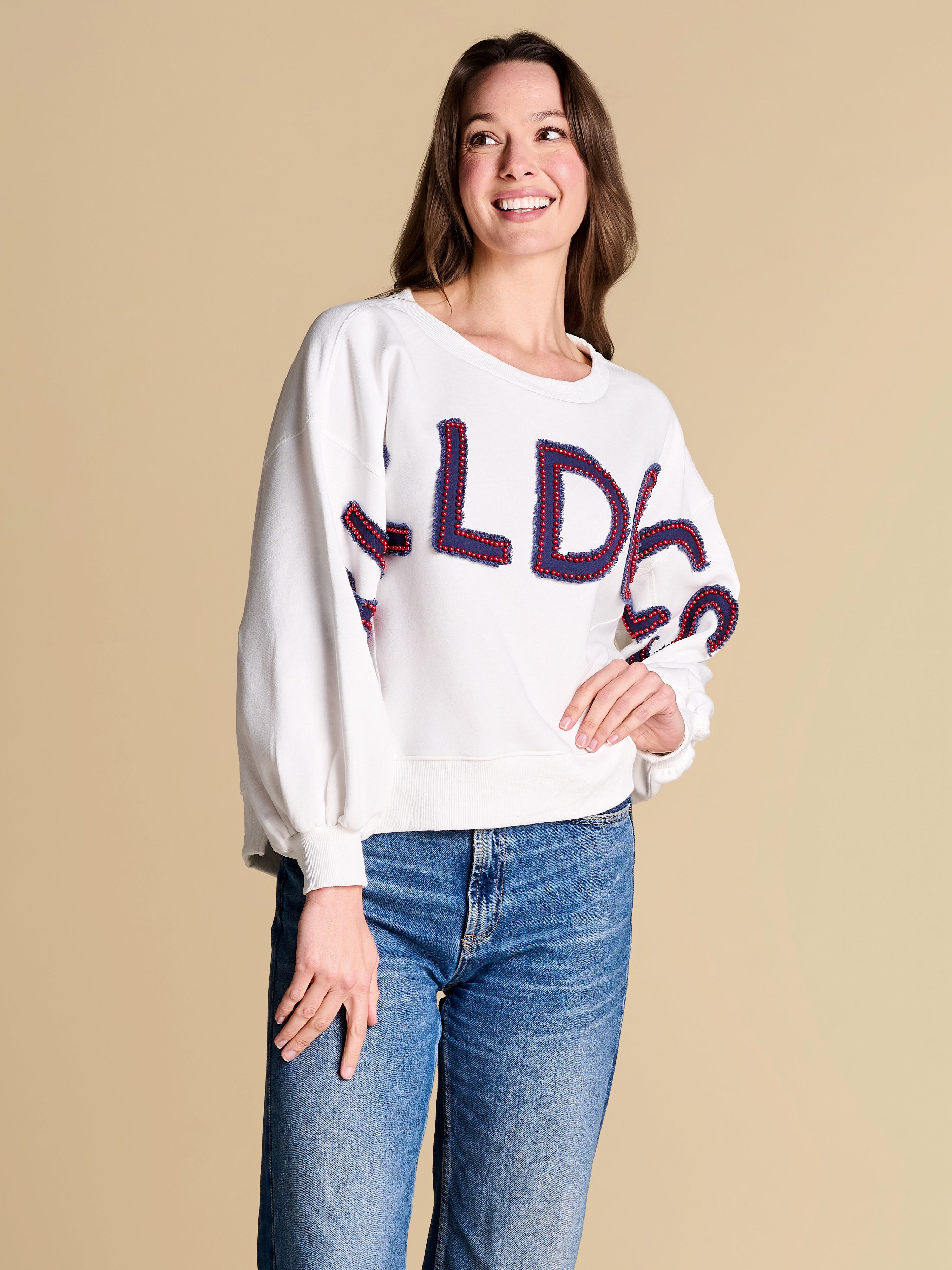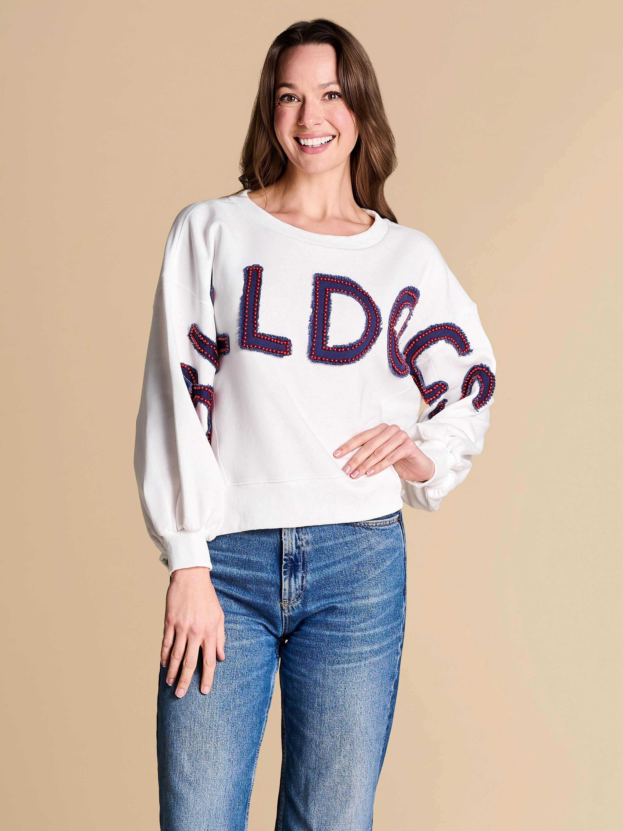 An elevated take on off-duty style, finished with raw-edge appliqué lettering and contrast pearl outlining. A warm-weather staple you’ll reach for on repeat, from slow market mornings to spirited match-day moments.