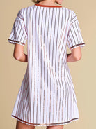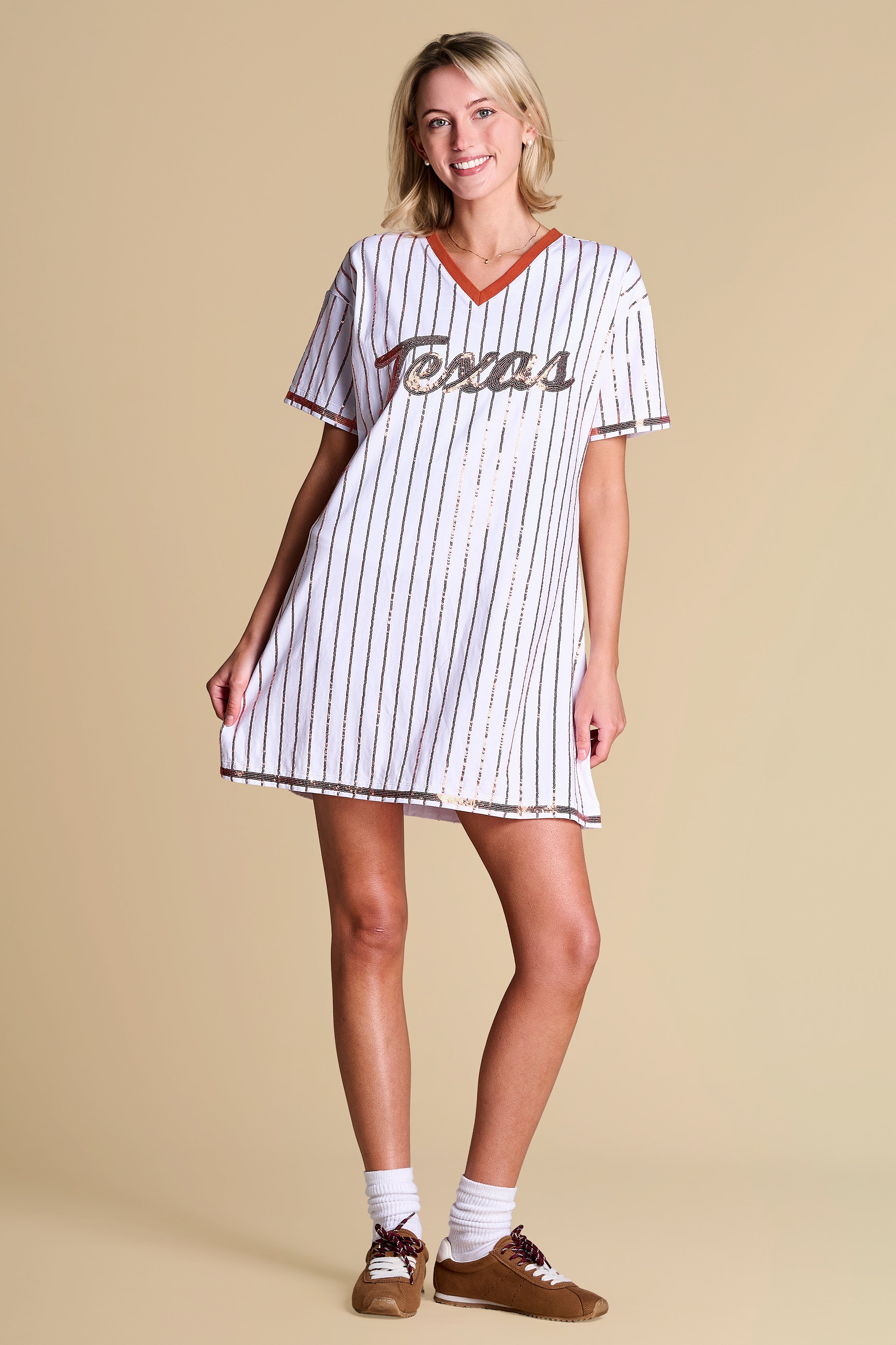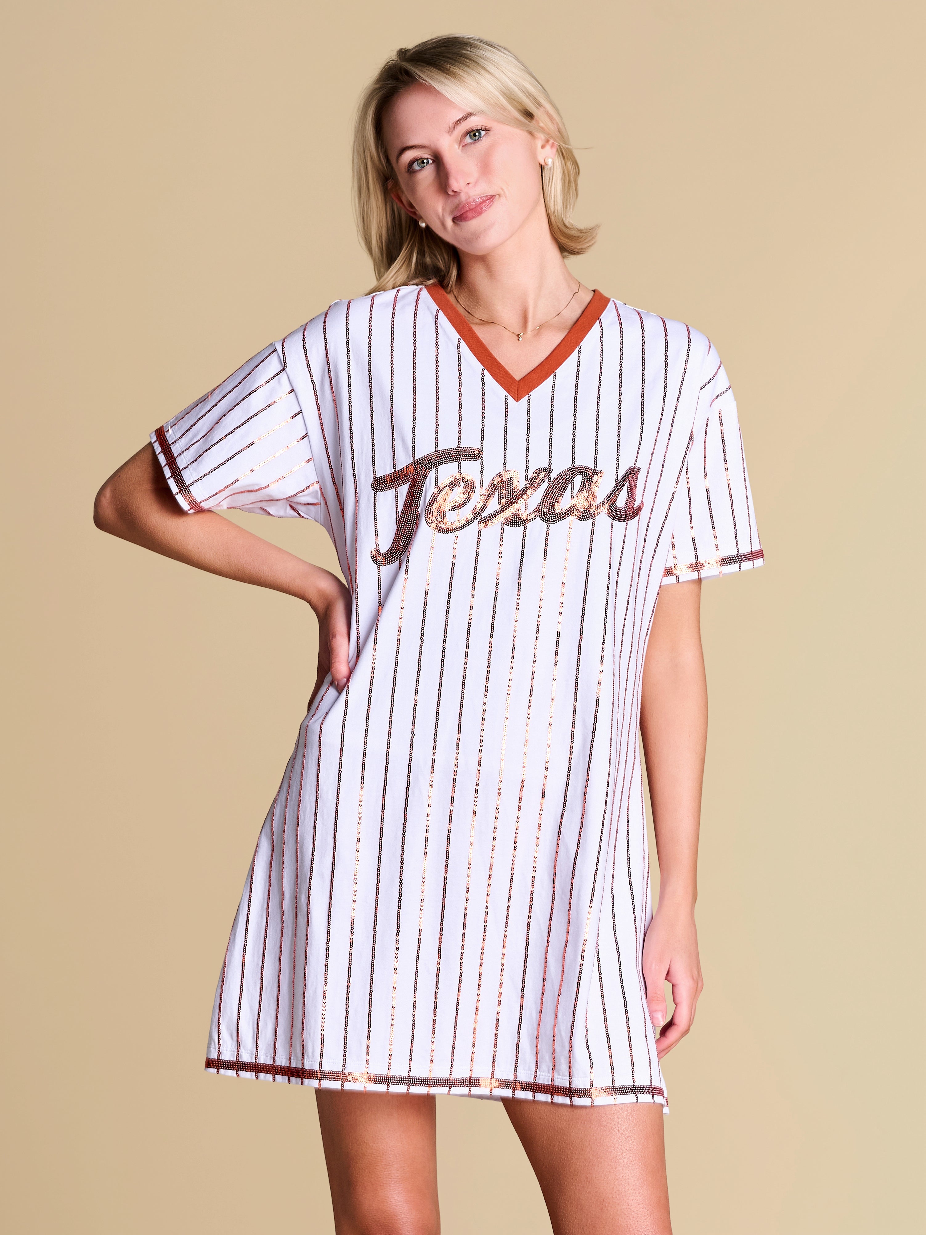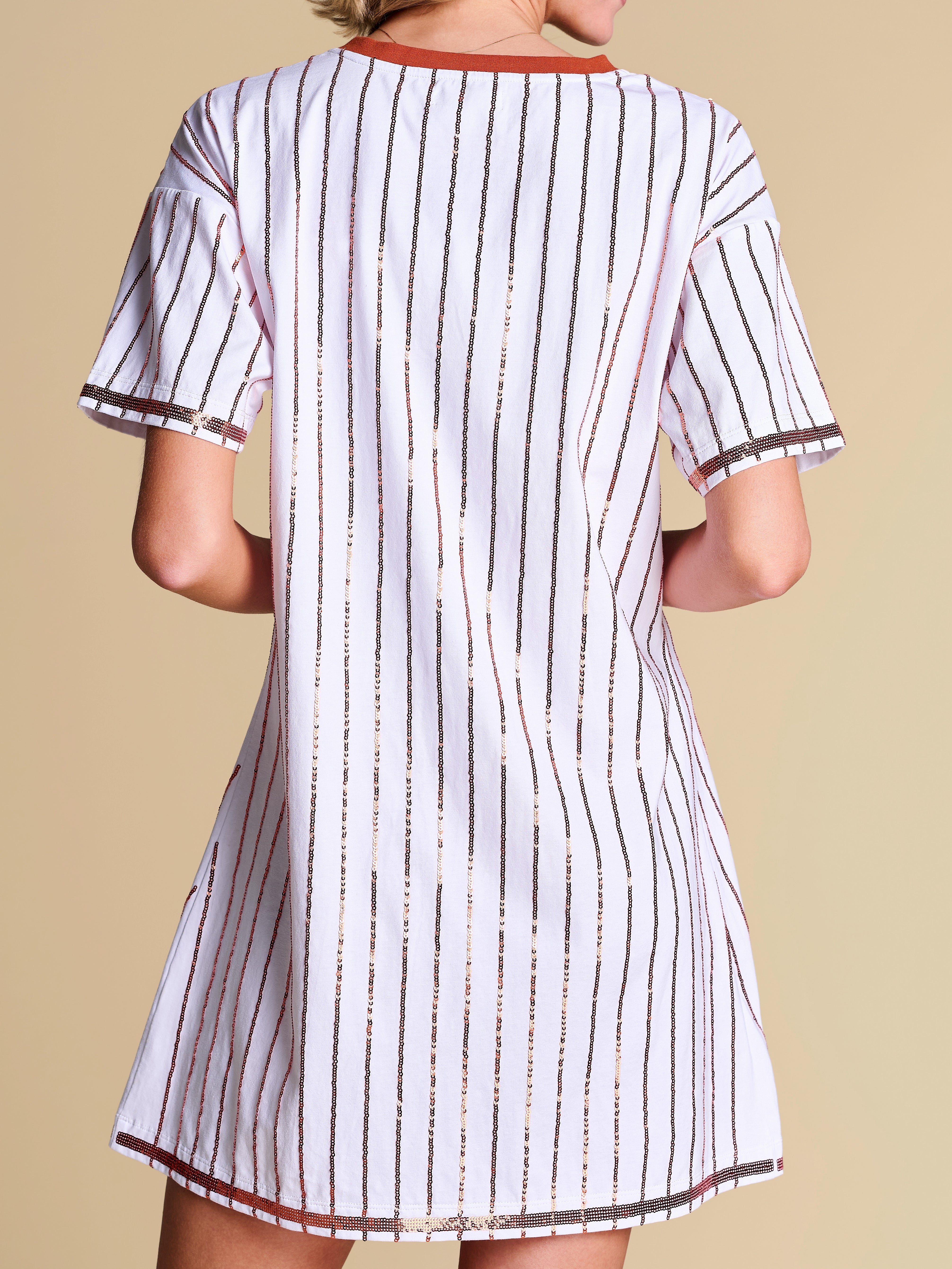 All bases are covered with this relaxed-fit tee dress — a little sporty, a lot statement, featuring a retro contrast V-neckline and standout sequin pinstripes. Feminine and playful, it’s your new go-to spring uniform for making an off-duty statement.