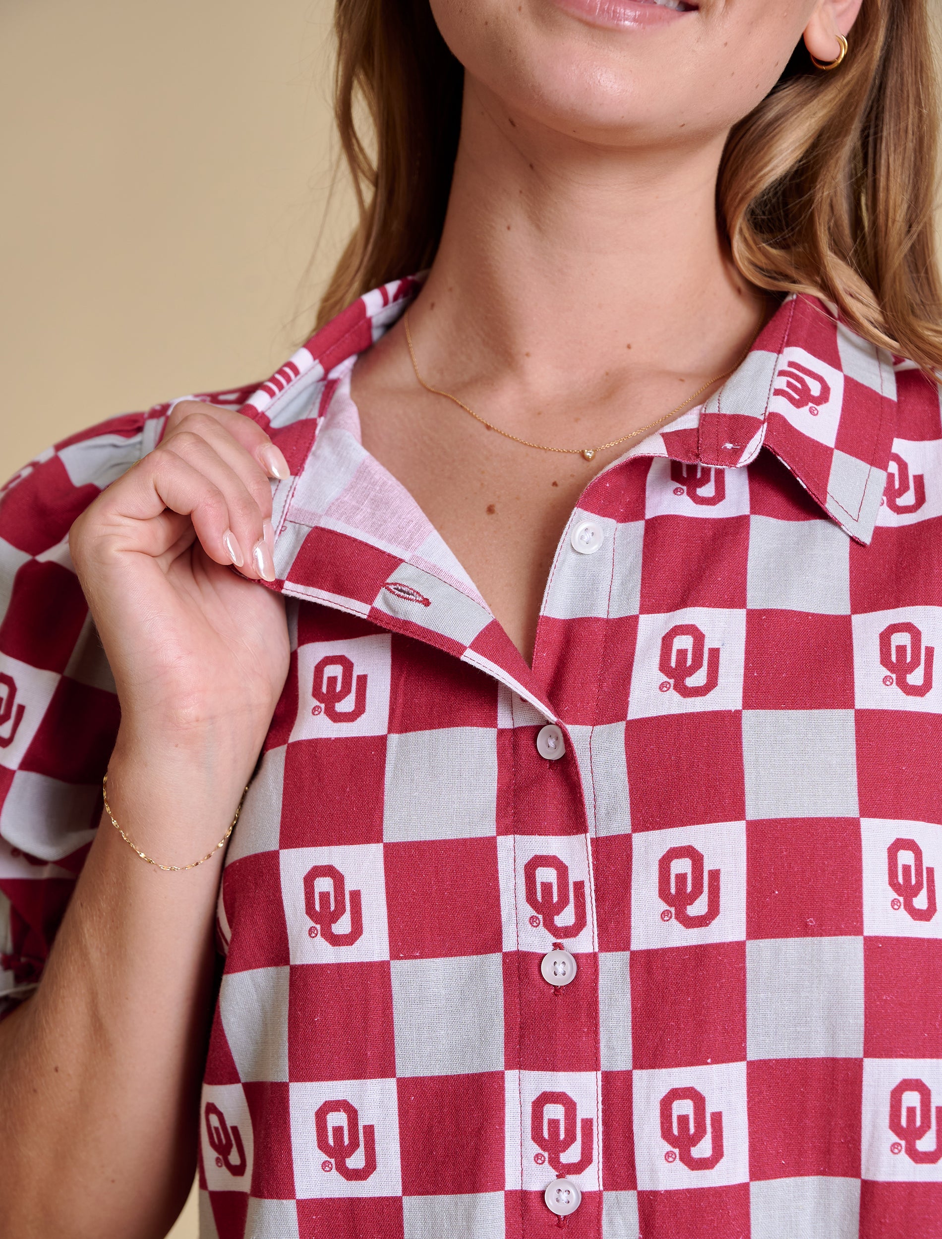 With ruffled hems, full sleeves, and a flirty A-line shape, this gingham dress delivers sweet school spirit with a polished twist. Made from a lightweight linen-cotton blend and featuring allover team logos, it’s as breathable as it is standout. Toss it on with tall boots or white sneakers for a classic Southern glam moment.