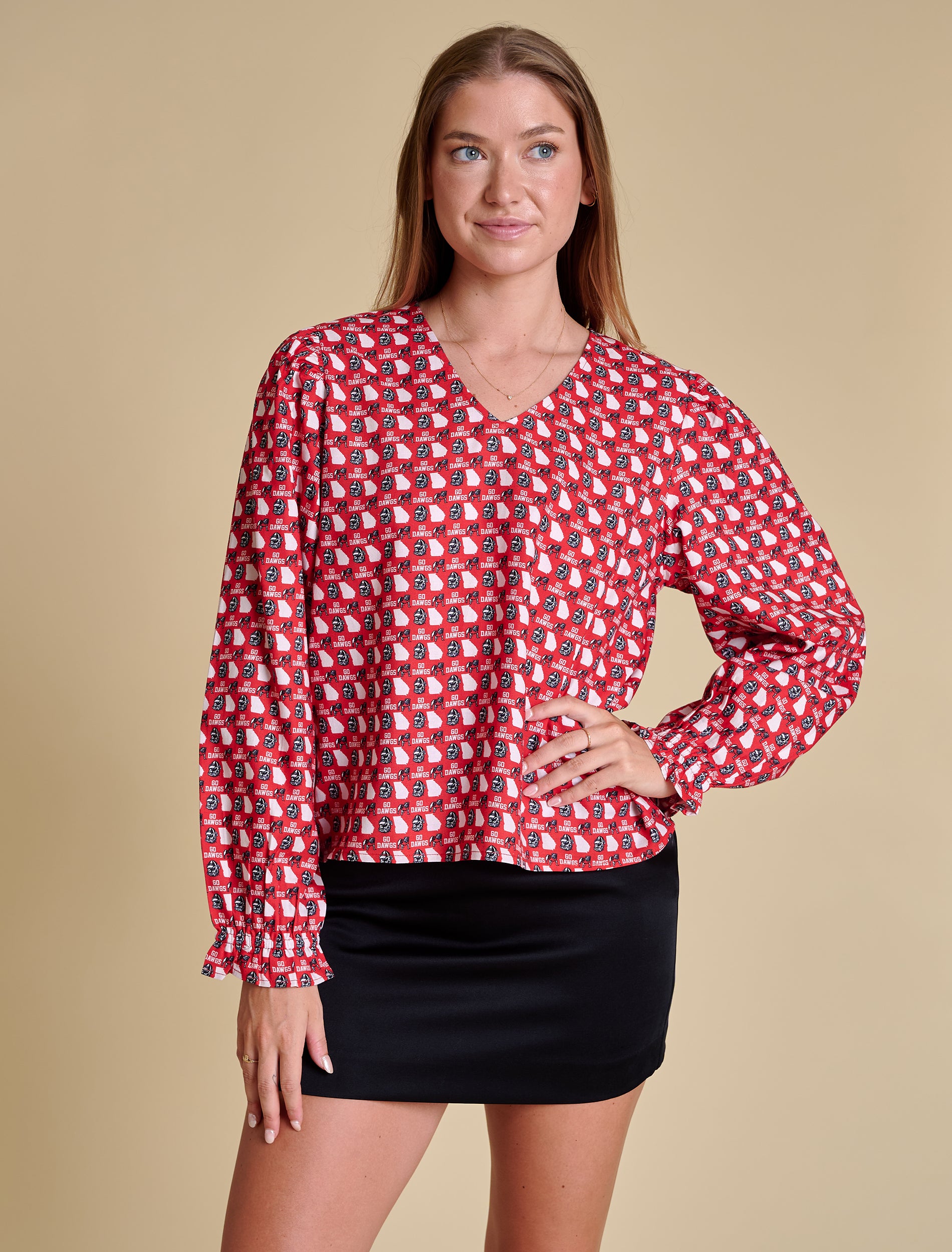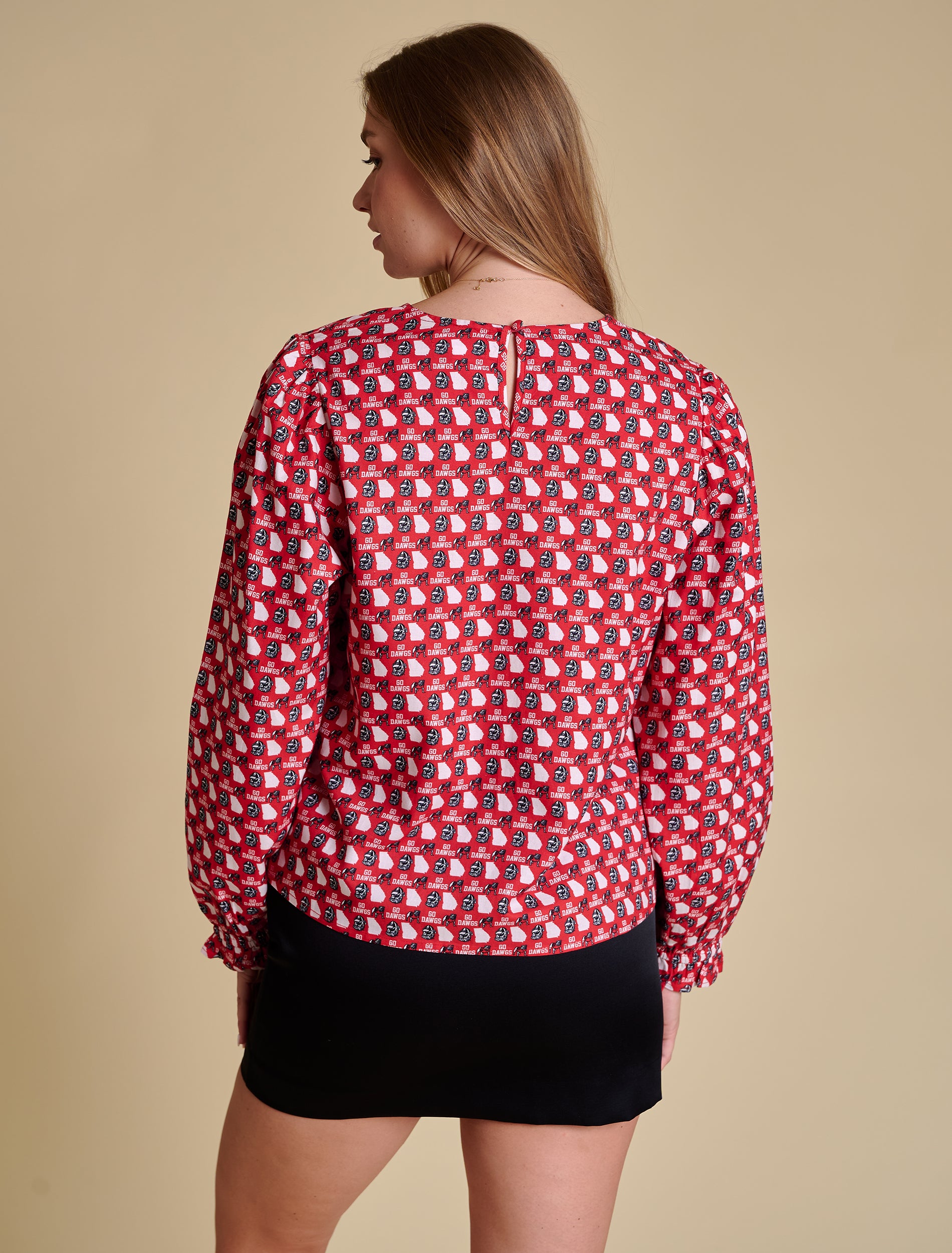 A timeless blouse with a gameday twist — this 3/4 sleeve top features delicate ruffle details at the neckline and cuffs, a flattering v-neckline, and a keyhole back closure. The brushed twill fabric feels soft but polished, while the custom repeat pattern adds team spirit in the most elevated way.