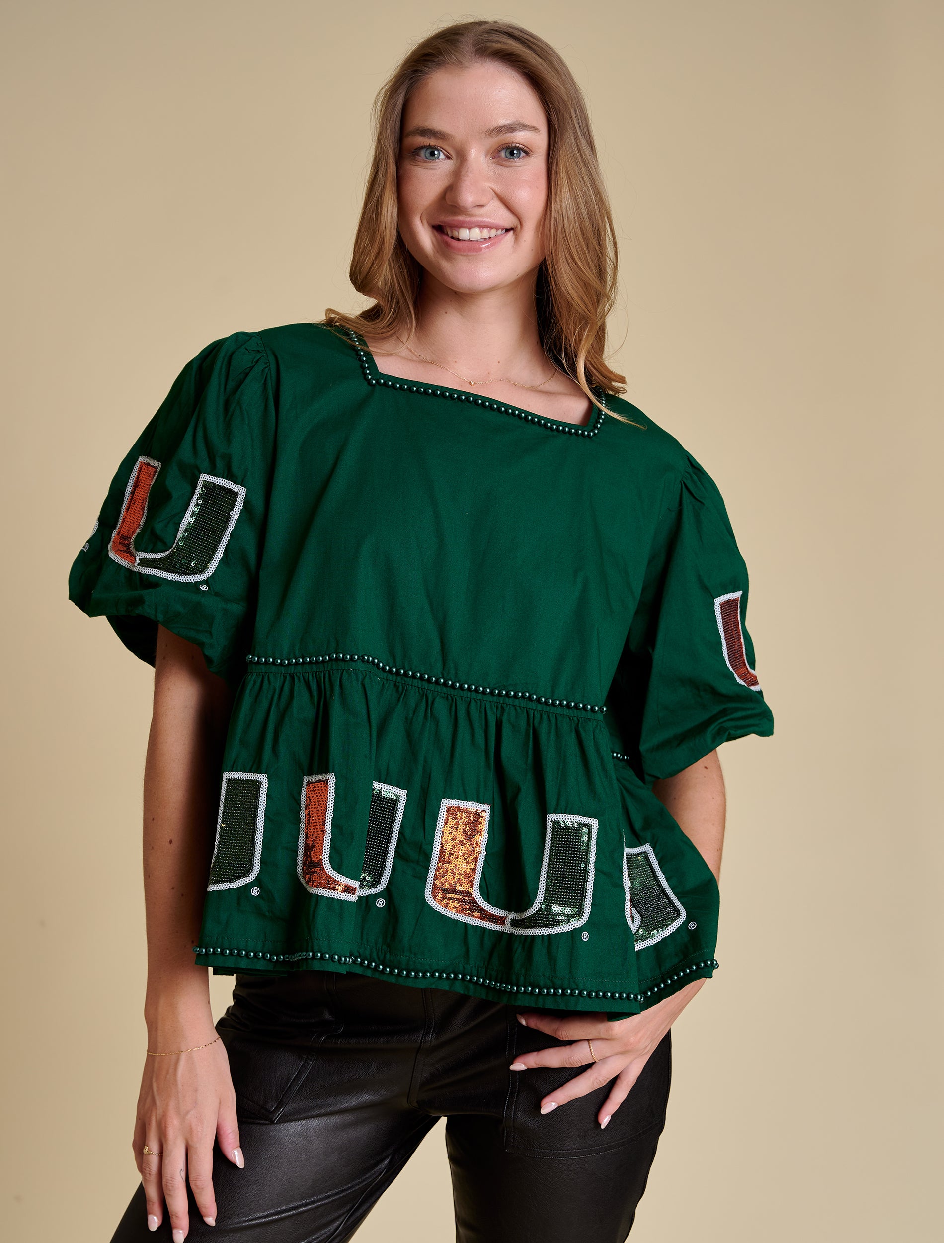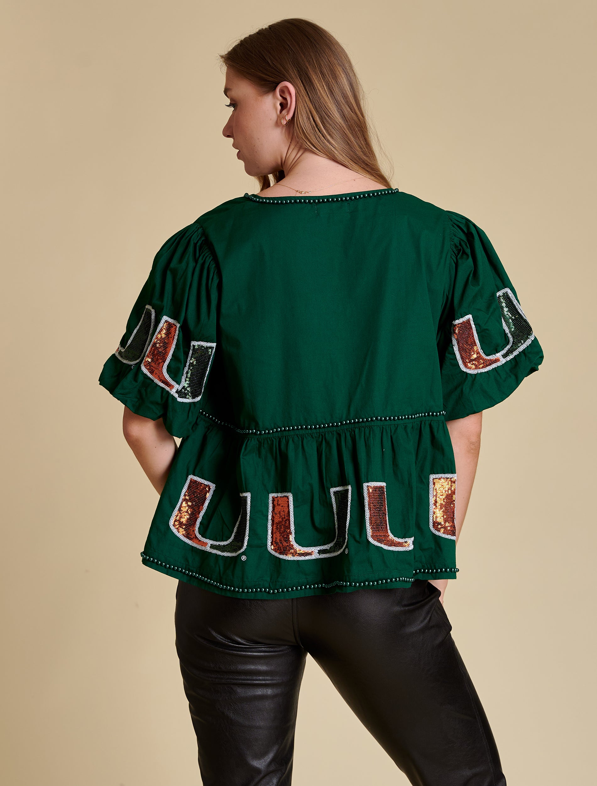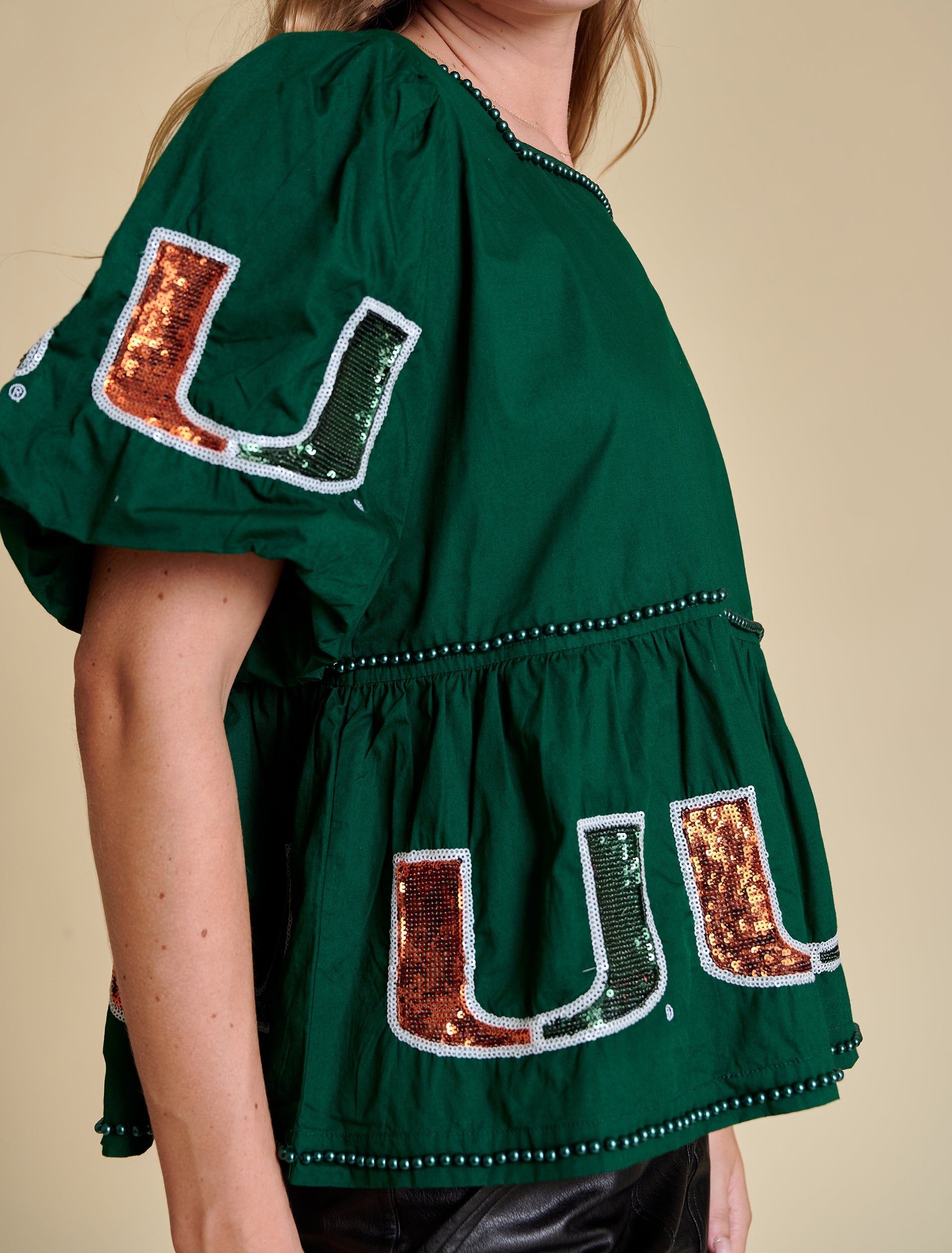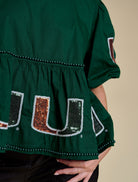 This peplum silhouette is crafted from crisp cotton poplin and finished with pearl embellishments and full sequin logos—perfectly balancing sweet and statement. The voluminous puff sleeves and cinched waist create a flattering shape. Style it with high-rise denim and a strappy heel, or wide-leg trousers for a trend-forward moment.