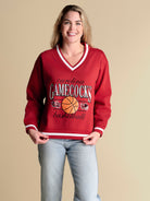 A fresh take on vintage style, the Courtside V-Neck Pullover blends relaxed comfort with playful details. Designed with an oversized fit and dropped shoulders, it’s finished with sporty contrast stripe ribbing at the neckline, sleeve cuffs, and hemline for a retro look. The mixed-media basketball motif, featuring holographic appliqué, sequins, and embroidered lettering, adds dimension and a hint of shimmer—perfect for making a courtside statement.